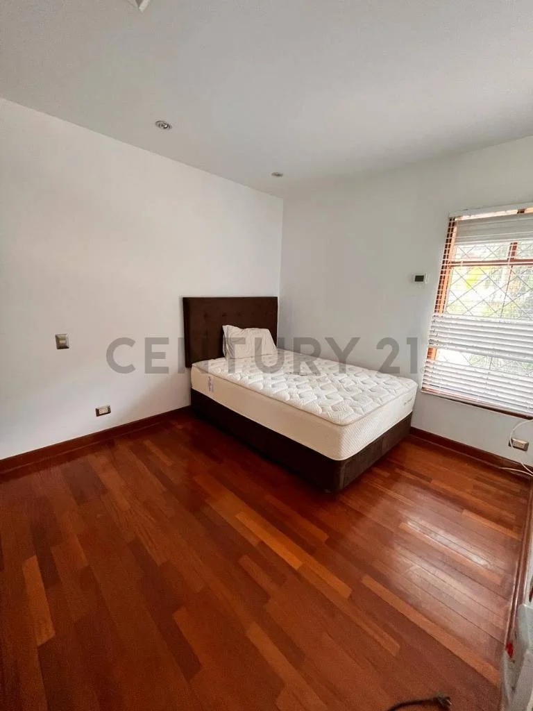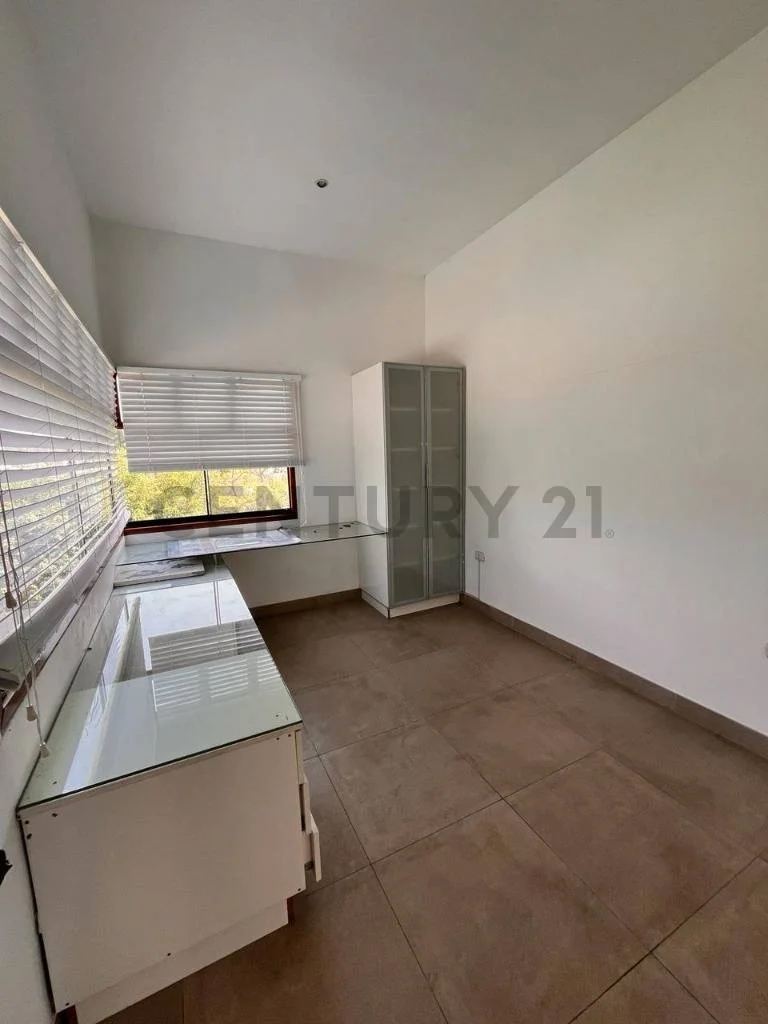 5 habitaciones, dos que comparten baño, una con baño propio, una usada como estudio y la principal con vista al jardín, walk-in closet grande y baño con tina hidromasaje.