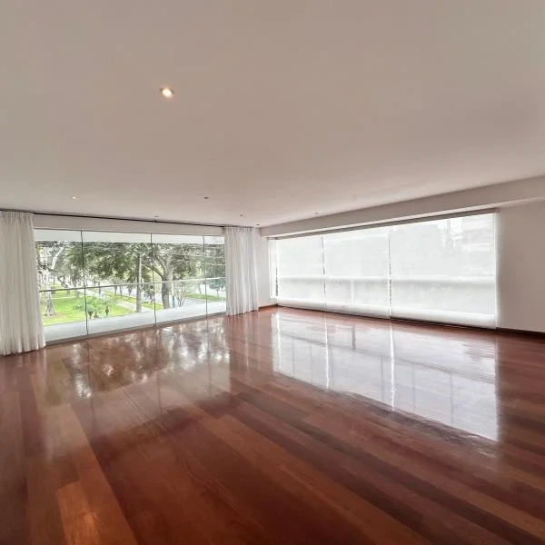Precioso Flat con muy bueno acabados y excelente distribucin Hall de ingreso amplia sala comedor terraza amplia con plena vista al parque Chabuca Granda bao de vista Cocina lavanderia cuarto y bao de servicio dormitorios baos completos incorporados sala de estar Dormitorio principal con salida a la terraza y vista al parque Todos los pisos son de madera Mucha iluminacin dptos por piso impecable cocheras paralelas con posibilidad de adquirir mas depsito Lobby amplio impecable con ascensores para cada torre dpto en total por torre cada una con su ascensor instalacin de gas natural Vigilancia