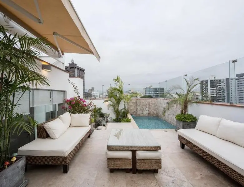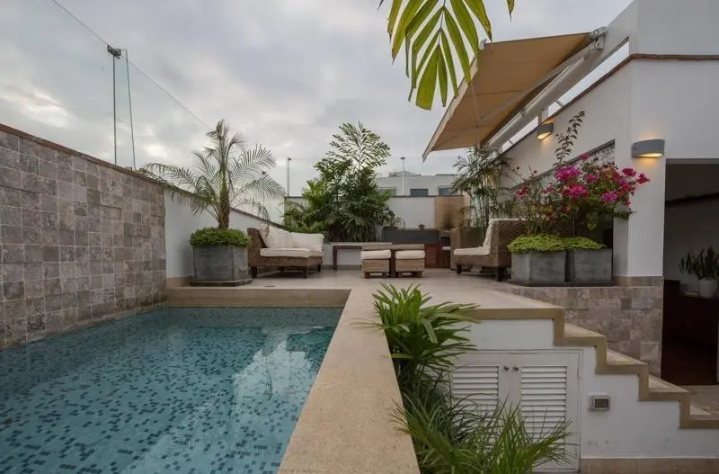 Segundo piso: En el segundo nivel se encuentra una sala de estar, el espacio perfecto para descansar o disfrutar de una película en familia. El baño completo adicional en este piso proporciona aún más comodidad. Lo que realmente distingue a este penthouse es su terraza muy amplia, que cuenta con una piscina privada y una zona de BBQ para reuniones y eventos al aire libre. También se encuentra un escritorio, ideal para quienes necesitan un espacio de trabajo en casa, y un dormitorio adicional con closet completo y baño incorporado, ofreciendo privacidad y confort para los huéspedes o familiares. Además, la propiedad incluye una lavandería, cuarto y baño de servicio, asegurando una funcionalidad completa.