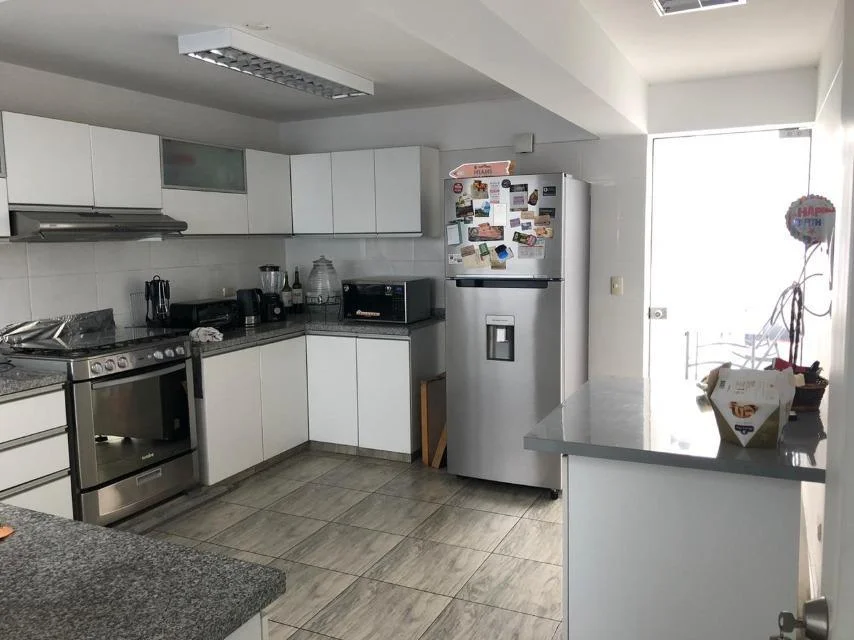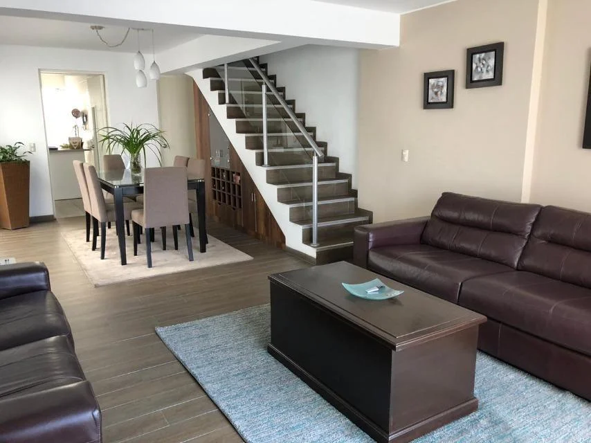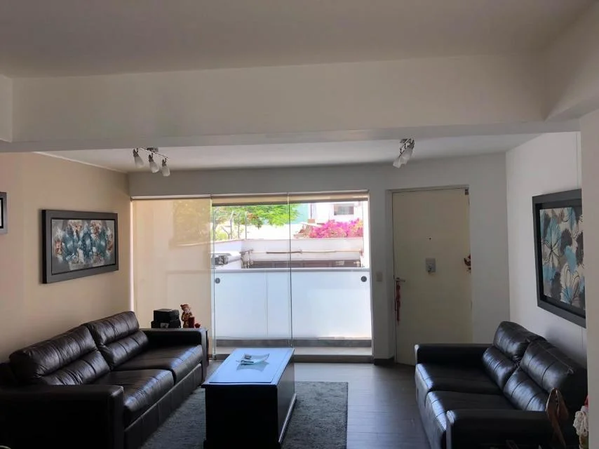 Cómodo y bien distribuido. Primer piso elevado. Piso 1: sala, comedor, balcón en sala, amplia cocina, baño de visita, mueble-bar, pequeño depósito, terraza, patio, lavandería, cuarto y baño de servicio. Piso 2: dormitorio principal con baño (tina) y balcón, 2 dormitorios secundarios que comparten un baño (ducha). Amplios clósets. Cerca a parques. Guardianía 12 hrs. 4 pisos, alquiler semi amoblado, 3 años de antigüedad, impecable, piso 1, 2 departamentos por piso, 6 departamentos en total. 2 cocheras en línea en sótano.