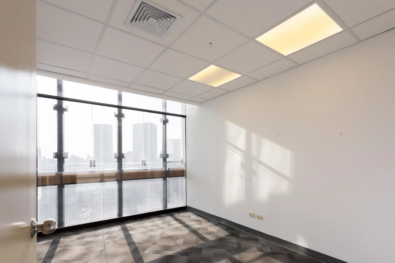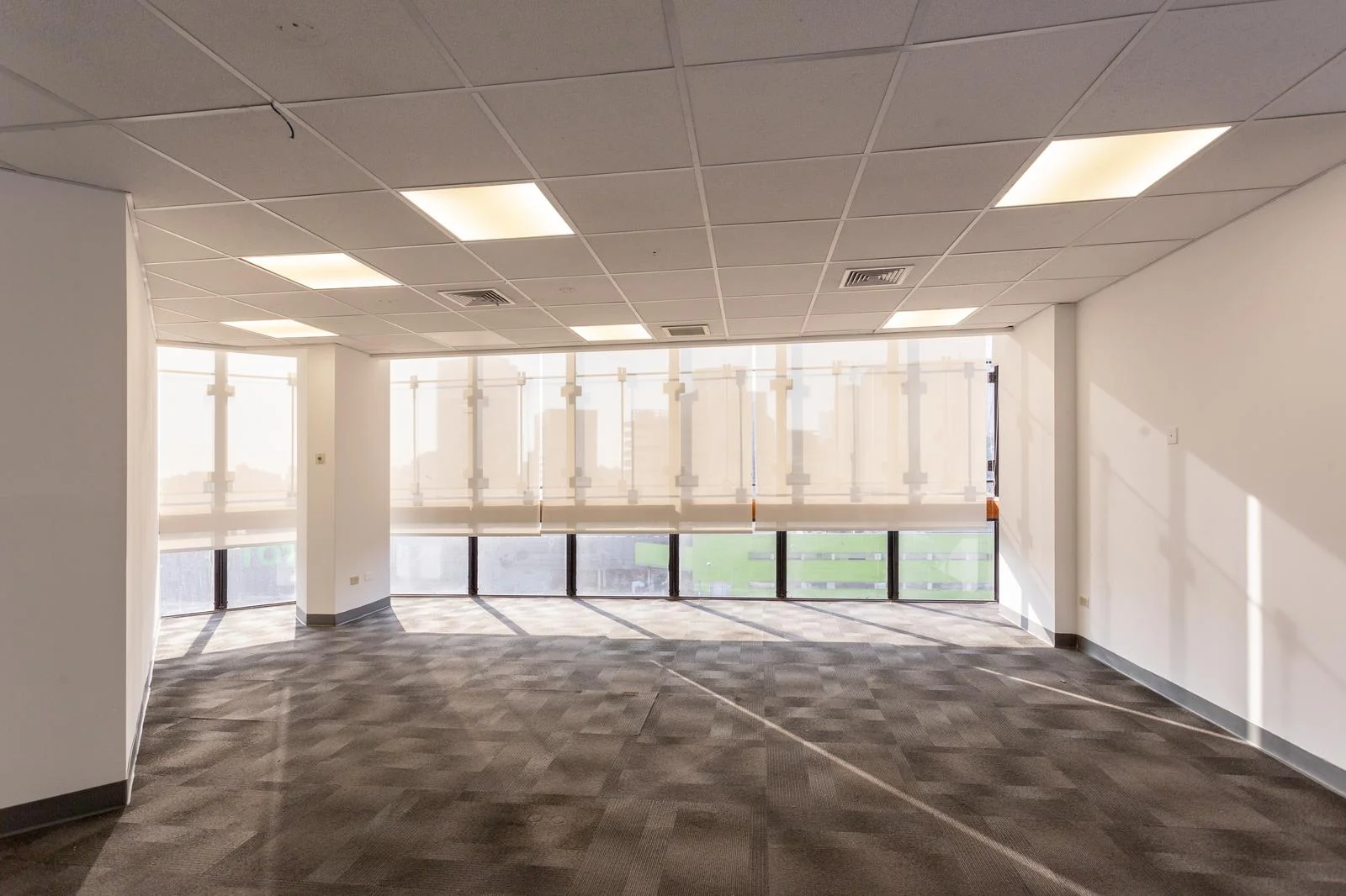 Rollers en las ventanas, regulando la iluminación y privacidad dentro de la oficina.