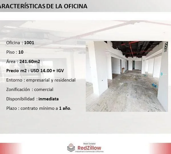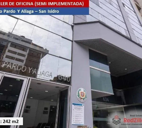 ALQUILER DE OFICINA IMPLEMENTADA m SAN ISIDRO TIPO Amplia oficina de m modernamente implementada en el piso del edificio Pardo y Aliaga ubicado en la zona empresarial del distrito de San IsidroUBICACIN Av Pardo y Aliaga en el distrito de San Isidro en zona empresarial y comercial CARACTERSTICAS DE EDIFICIO Sala de Usos Mltiples Sala de Proveedores Aire Acondicionado Grupo Electrgeno CONTACTAR Celular WhatsApp Igualmente puedes comunicarte para revisar nuestra disponibilidad de locales similares o alternativos que se ajusten a tu necesidad Somos RedZillow especialistas en servicios corporativos abarcando desde la representacin de propietarios y arrendatarios hasta el financiamiento de capital a largo plazo Nuestra meta es ayudarte a fortalecer y enriquecer la inversin en tu negocio ocupndonos de soportar tus decisiones inmobiliarias sobre espacios de oficinas almacenes retail terrenos y plantas industrialesSomos RedZillow especialistas en servicios corporativos inmobiliarios con alto compromiso y experiencia en la representacin de propietarios compradores y arrendatarios Nuestra meta es ayudarte a encontrar el mejor espacio para negocio o actividad comercial ocupndonos de soportar tus decisiones inmobiliarias relacionadas a espacios de almacenes plantas industriales locales comerciales oficinas y terrenos