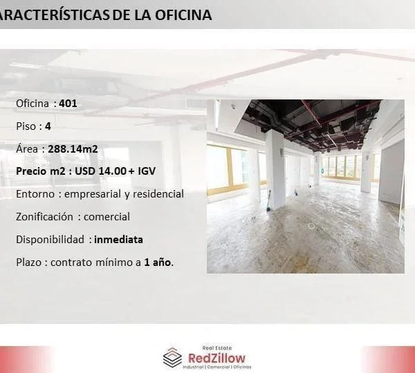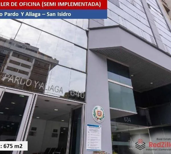ALQUILER DE OFICINA IMPLEMENTADA m SAN ISIDRO TIPO Amplia oficina de m modernamente implementada en el piso del edificio Pardo y Aliaga ubicado en la zona empresarial del distrito de San IsidroUBICACIN Av Pardo y Aliaga en el distrito de San Isidro en zona empresarial y comercial CARACTERSTICAS DE EDIFICIO Sala de Usos Mltiples Sala de Proveedores Aire Acondicionado Grupo Elctrgeno CONTACTAR Celular WhatsApp Igualmente puedes comunicarte para revisar nuestra disponibilidad de locales similares o alternativos que se ajusten a tu necesidad Somos RedZillow especialistas en servicios corporativos abarcando desde la representacin de propietarios y arrendatarios hasta el financiamiento de capital a largo plazo Nuestra meta es ayudarte a fortalecer y enriquecer la inversin en tu negocio ocupndonos de soportar tus decisiones inmobiliarias sobre espacios de oficinas almacenes retail terrenos y plantas industrialesSomos RedZillow especialistas en servicios corporativos inmobiliarios con alto compromiso y experiencia en la representacin de propietarios compradores y arrendatarios Nuestra meta es ayudarte a encontrar el mejor espacio para negocio o actividad comercial ocupndonos de soportar tus decisiones inmobiliarias relacionadas a espacios de almacenes plantas industriales locales comerciales oficinas y terrenos