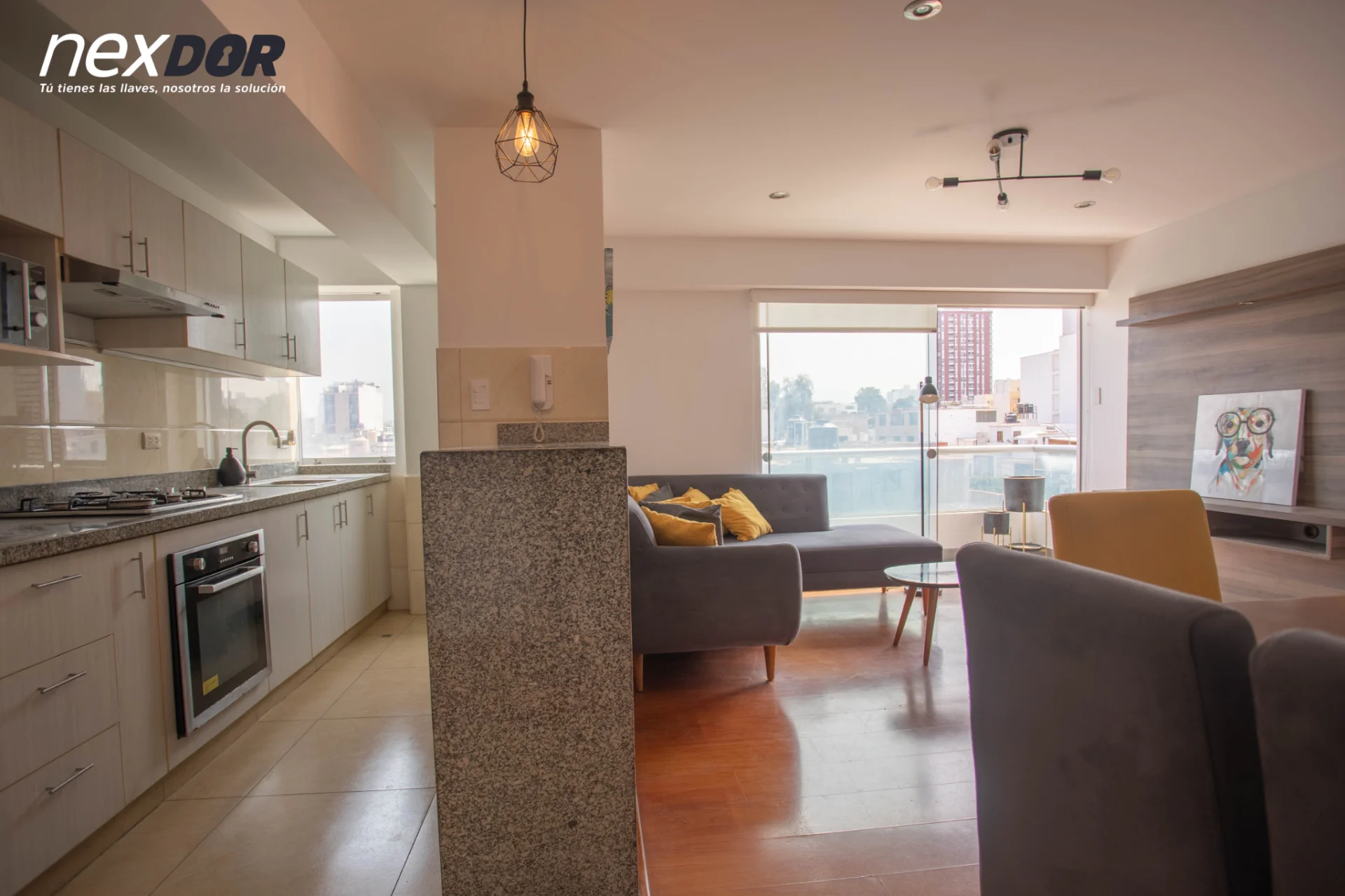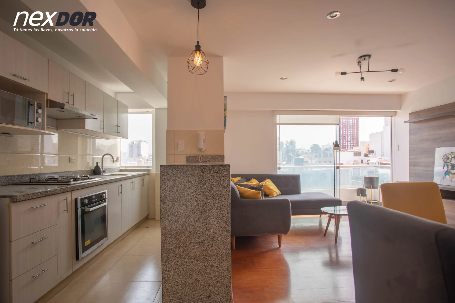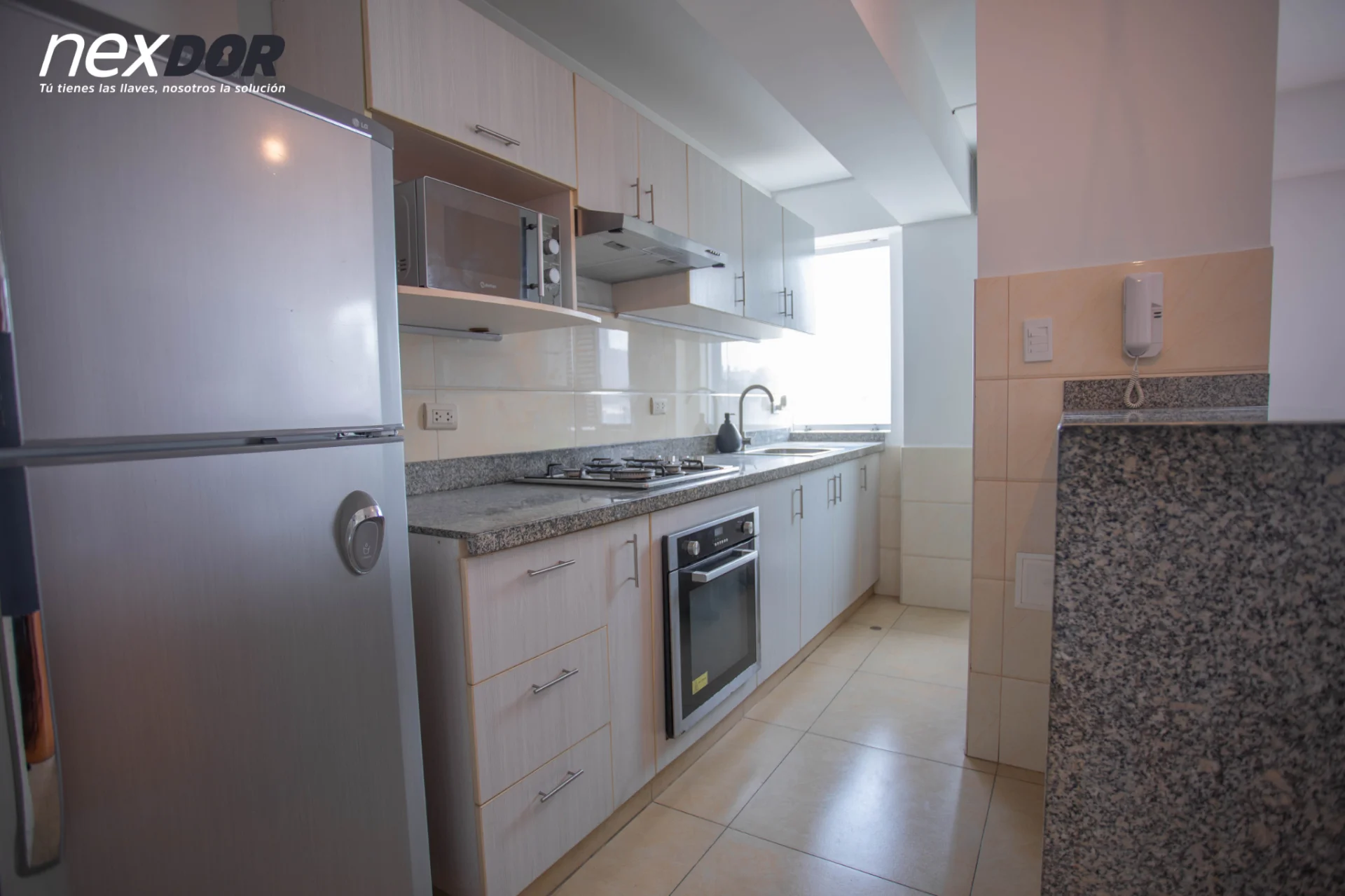 - Cocina abierta con barra, muebles altos y bajos, refrigeradora, cocina, horno, campana y microondas
