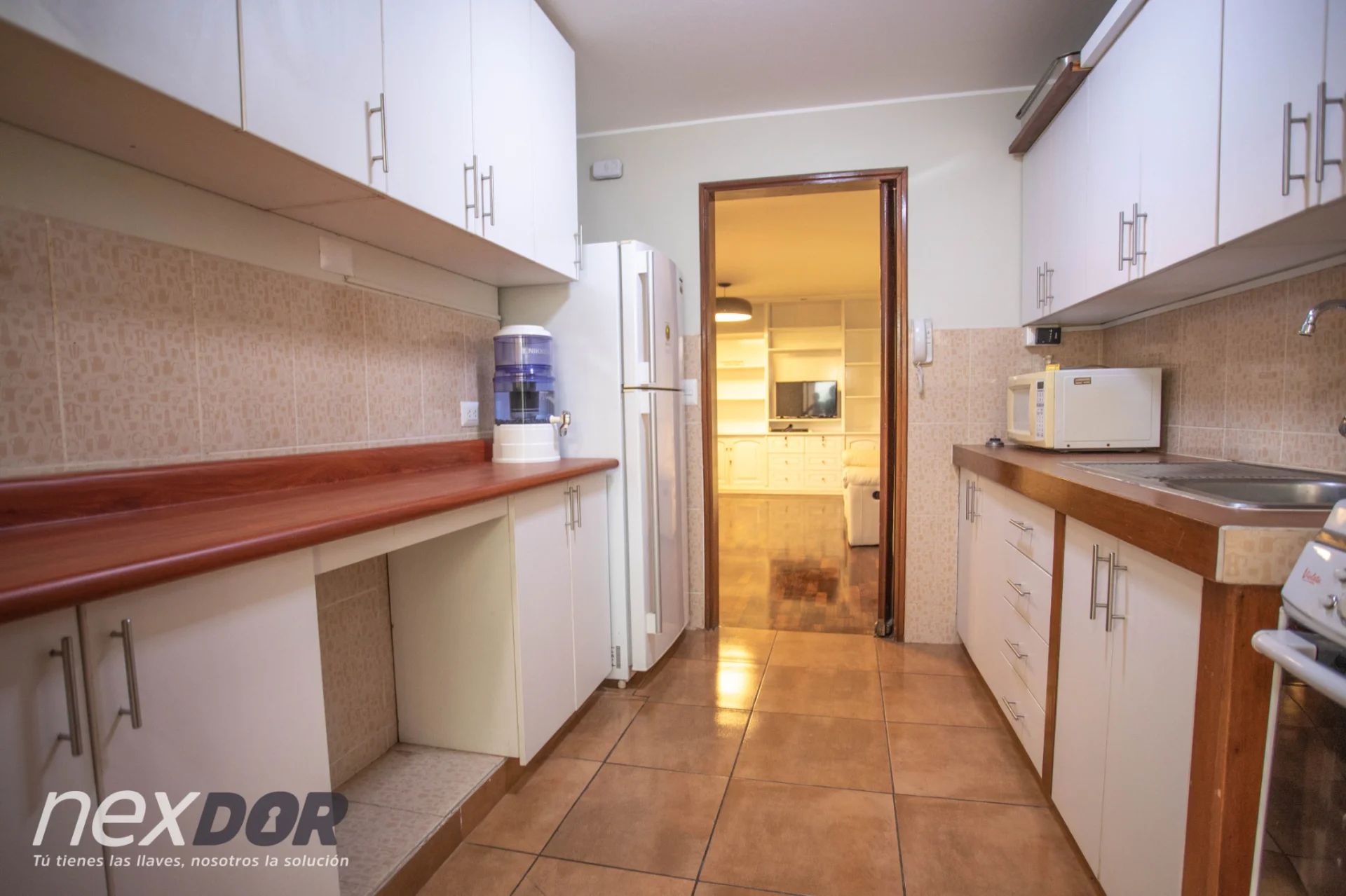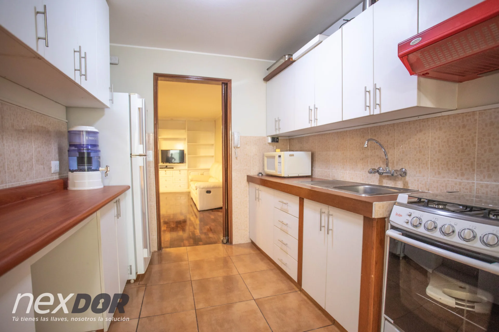 - Cocina equipada: muebles altos y bajos, cocina de 4 hornillas, campana extractora, horno, refrigeradora, microondas y utensilios
