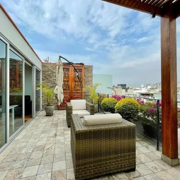 Se vende o Alquila penthouse en Chacarilla Surco rea m Sala Comedor con balcn Bao de visitas Cocina con alacena depsito campana horno empotrado comedor de diario Sala de estar con chimenea Dormitorio principal con amplio closet y bao incorporado Dormtorios secundarios cu closet empotrado Bao completo Sala de estar Bao visita Terraza con techo sol y sombra zona parrilla con horno a lea Servicio completo estacionamientos Depsito Mantenimiento S Antigedad aos rea comn Gimnasio estacionamiento visitas