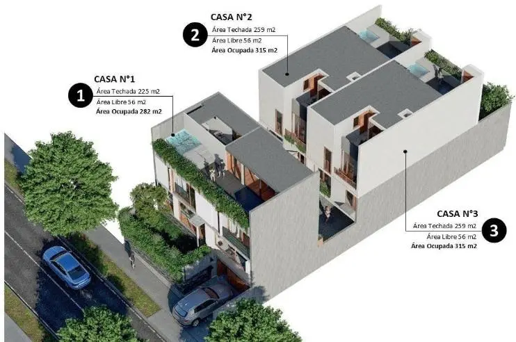 • Área construida: 282 m² (Casa 1) y 315 m² (Casas 2 y 3)
