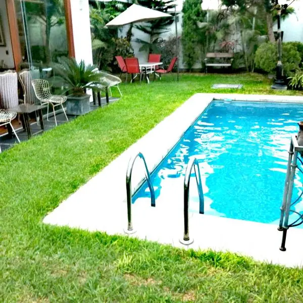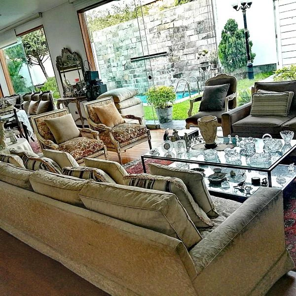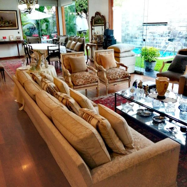 Moderna Casa de dos pisos en Rinconada tiene metros de terreno y construidos Situada en zona residencial y con seguridad a dos cuadras de la tranquera La casa tiene aos muy iluminada y bien distribuida con acabados modernos y finos madera en los pisos y escalera y closets marmol en los baos cociba acero vidrio y madera en la escalera En el primer piso hay un recibidor o salita y una sala y comedor amplios con mucha luz toda con mamparas de vidrio que da al jardin y a la piscina una moderna y amplia cocina con una isla de marmol y muebles altos y bajos muy espaciosa y cmoda tambien tiene al lado de la cocina un comedor de con diario una lavanderia grande y un cuarto de servicio cmodo con su bao En el primer piso tambin hay un dormitorio amplio con un bao completo Se sube al segundo piso por una moderna escalera de madera vidrio y acero entrando a la sala de estar o de televisin Se puede subir o bajar tambin por un ascensor que sube desde el patio hacia la sala de estar En el tercer nivel hay tres dormitorios muy amplios todos con bao incorporado y muy buenos closet El dormitorio principal tiene ademas un walkin closet grande tamao de un cuarto y un bao grande con amplia ducha y yacuzzi Otro de los dormitorios tiene tambien un balcn con vista a la psicina en el primer piso est el jardin terraza rea parrilla y una piscina impecable con caida de agua La arquitectura es moderna y atemporal Tiene estacionamiento para dos carros en forma paralela y puerta levadiza Cuenta con intercomunicadores en todos los cuartos videoportero alarma y seguridad de la urbanizacin La casa tiene entrada por la calle Victoria pero tambien por la calle Tiberiades
