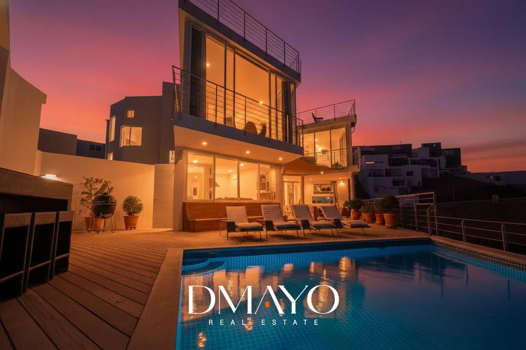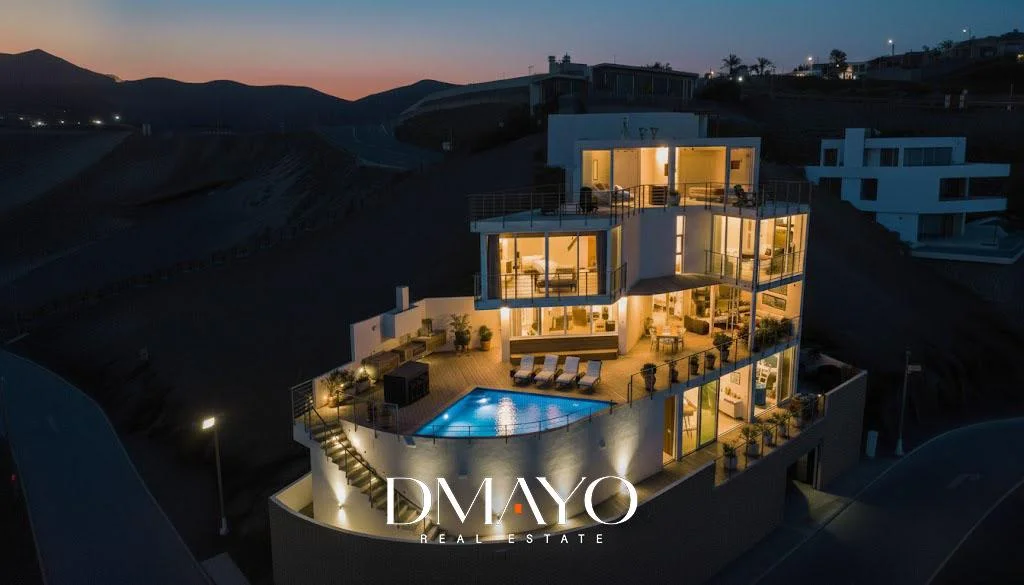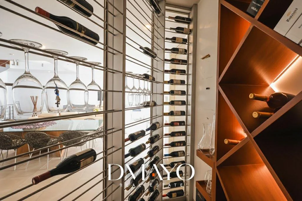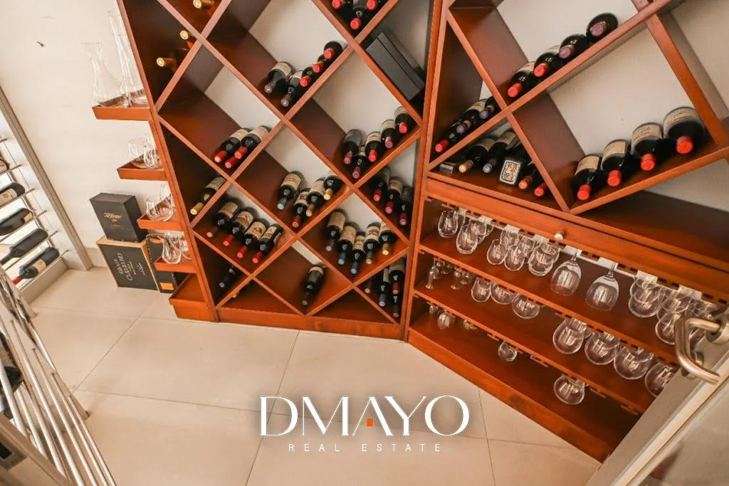 “Una casa de tres niveles, con seis suites, ascensor, cava de vinos, sala de juegos, piscina infinita… y una vista que parece no terminar nunca.”