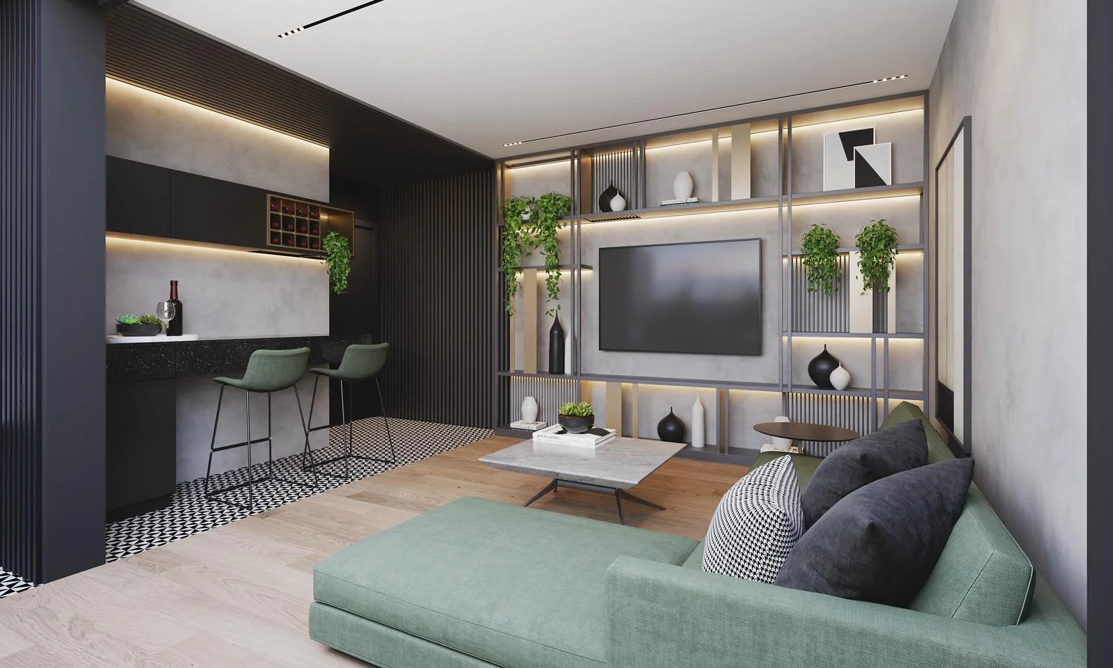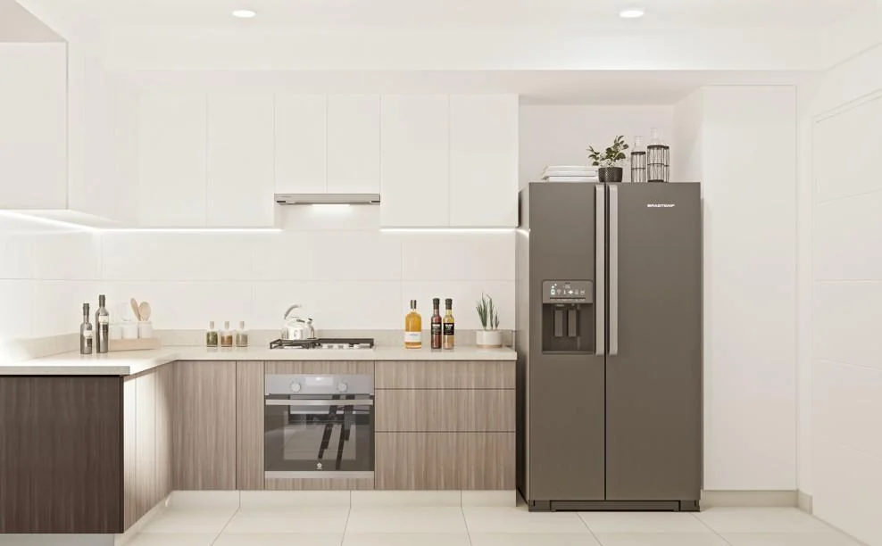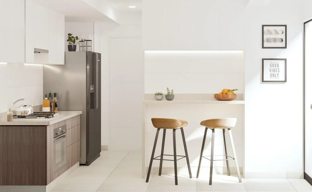 • Cocina americana con tablero de cuarzo, muebles altos y bajos