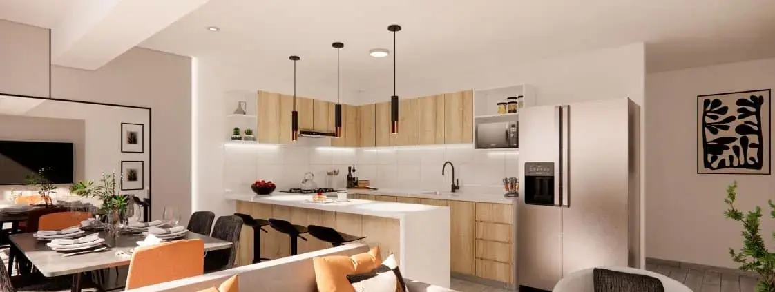 Cada departamento ha sido diseñado con espacios amplios y bien distribuidos. El hall de entrada conduce a una amplia sala, seguida de un comedor que se conecta con la cocina abierta, equipada con muebles altos y bajos, y una mesada con espacio para comedor de diario. También cuenta con un baño de visitas y una lavandería, agregando mayor funcionalidad al diseño.