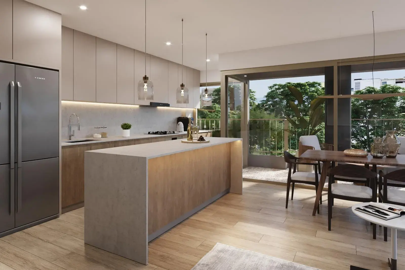 Ascensor directo, sala, comedor, cocina abierta con muebles altos y bajos con isla para comedor de diario, lavanderia, cuarto y baño de servicio.