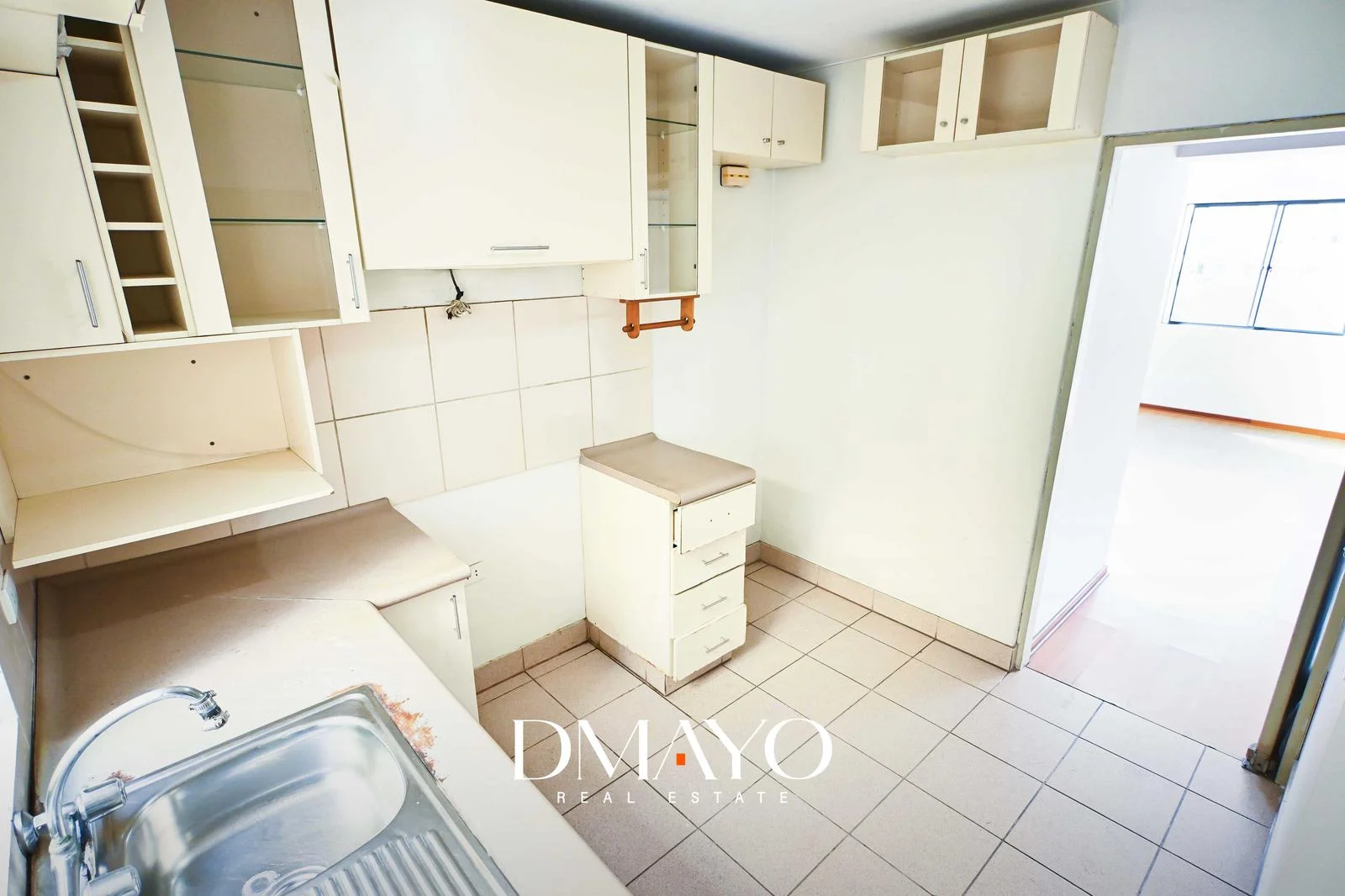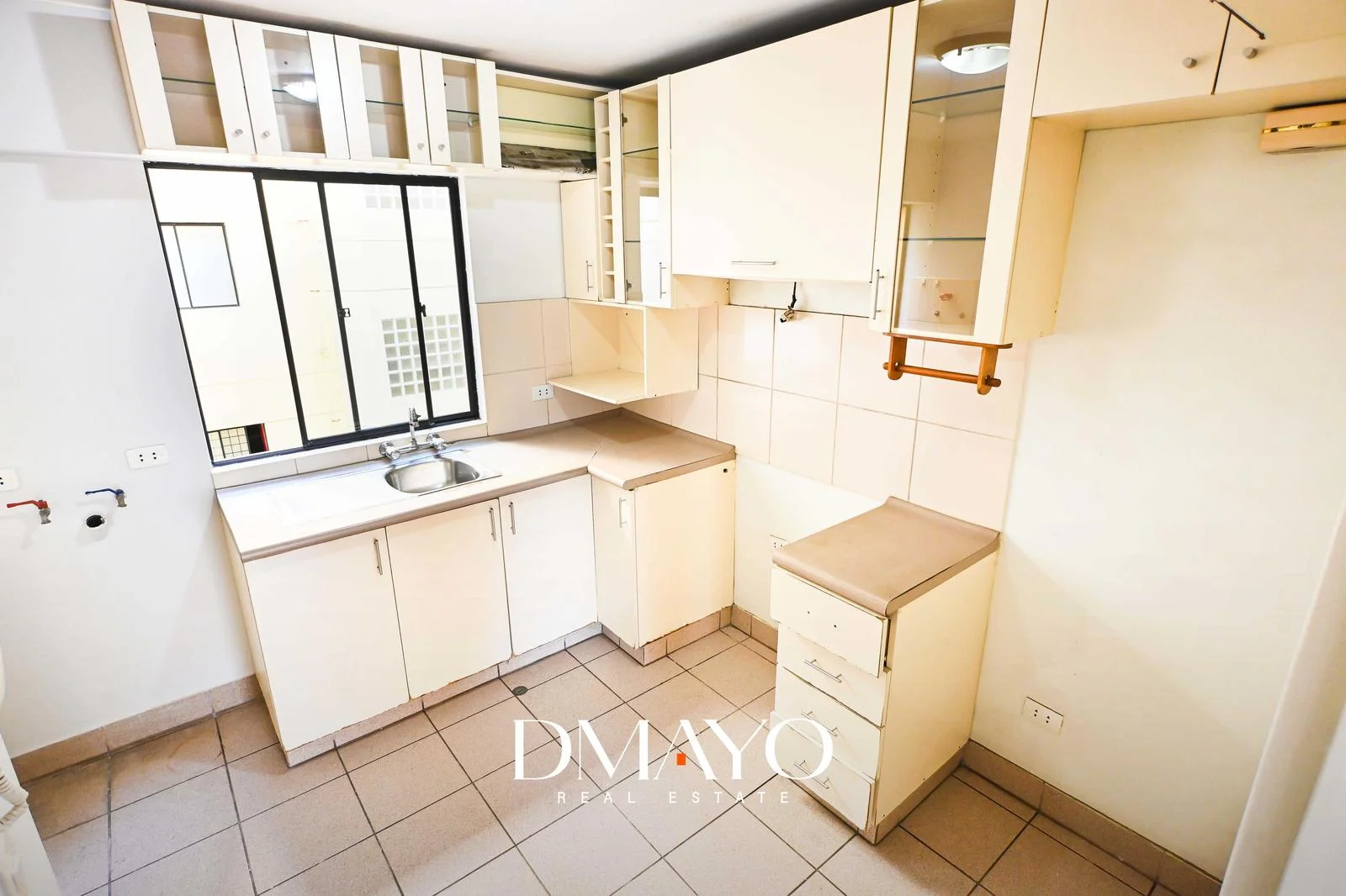 * Cocina cerrada, funcional y bien distribuida, con muebles altos y bajos.