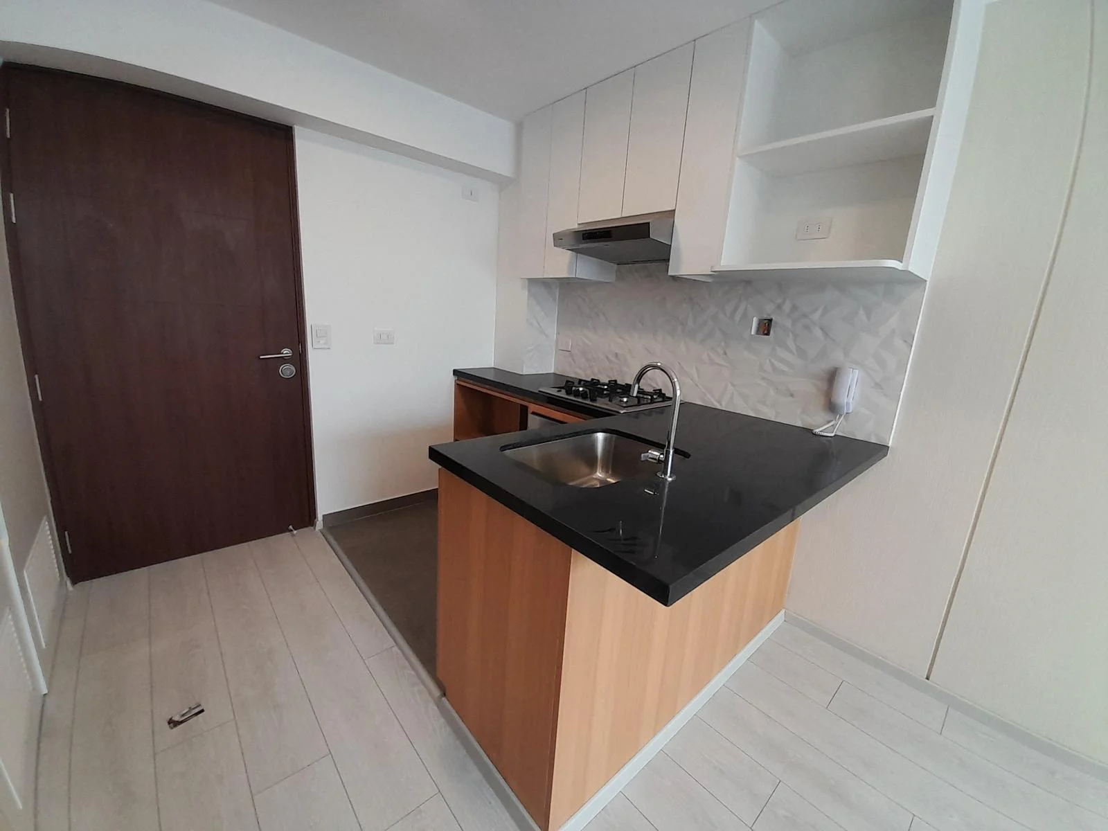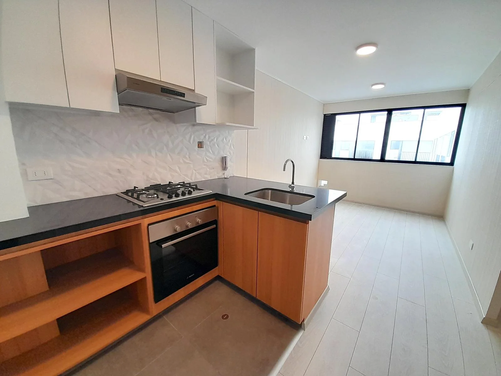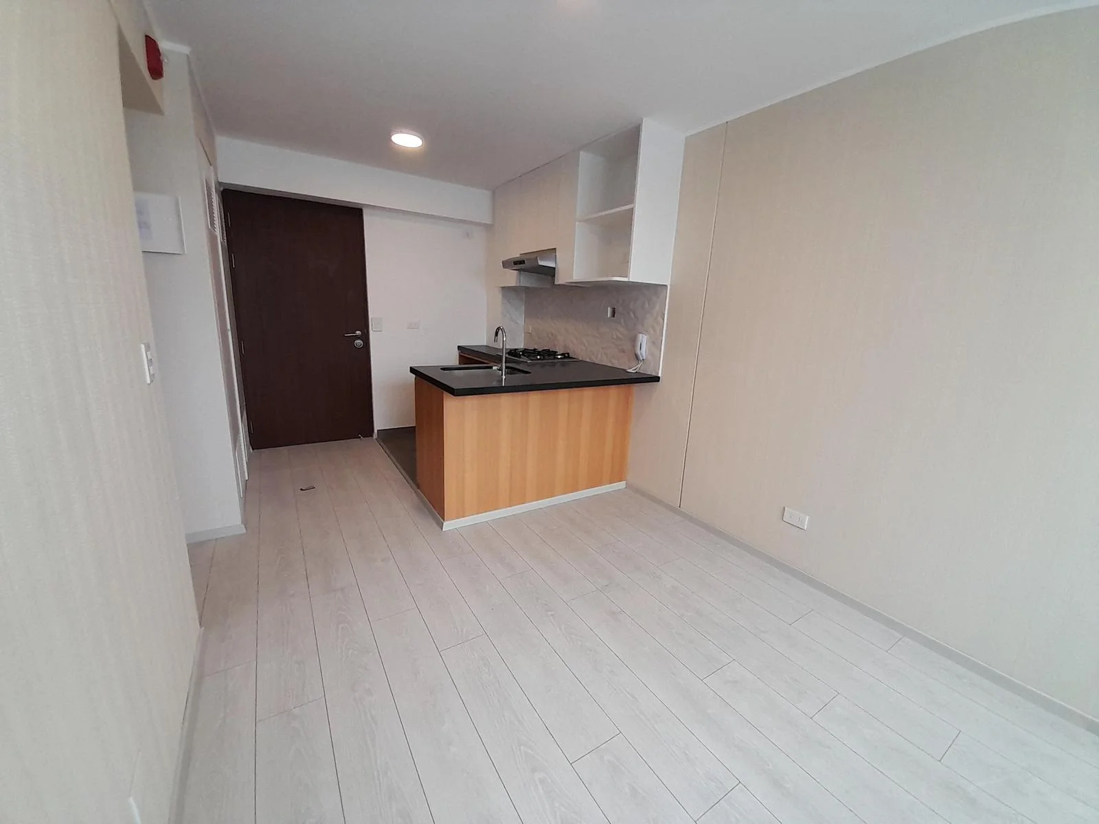 Este moderno departamento ofrece una vista panorámica hacia San Isidro y está completamente conectado a gas natural. La cocina tipo kitchenette está equipada con muebles de melamina, tanto altos con acabado blanco mate como bajos con acabado tipo madera, y cuenta con electrodomésticos Bosch de alta calidad, incluyendo horno, encimera y campana extractora. Además, dispone de una terma a gas marca Rheem de 8 litros.