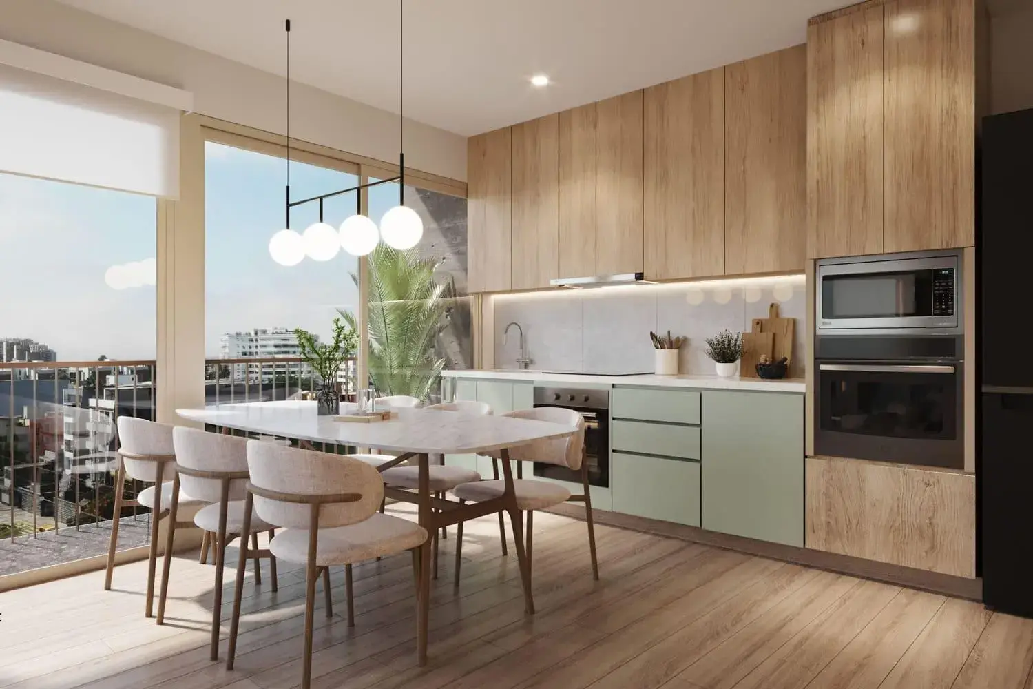 Este departamento está diseñado con una disposición que maximiza la comodidad y funcionalidad de cada espacio. Al ingresar, te recibe una amplia sala-comedor, un área integrada ideal para disfrutar de momentos sociales y familiares, ofreciendo un ambiente acogedor y luminoso. El espacio se complementa con un encantador balcón que proporciona una agradable vista al exterior y permite la entrada de luz natural, creando una atmósfera fresca y relajante. La cocina, de concepto abierto, está inteligentemente distribuida para aprovechar cada rincón, facilitando las labores culinarias mientras mantienes una interacción fluida con las demás áreas comunes.