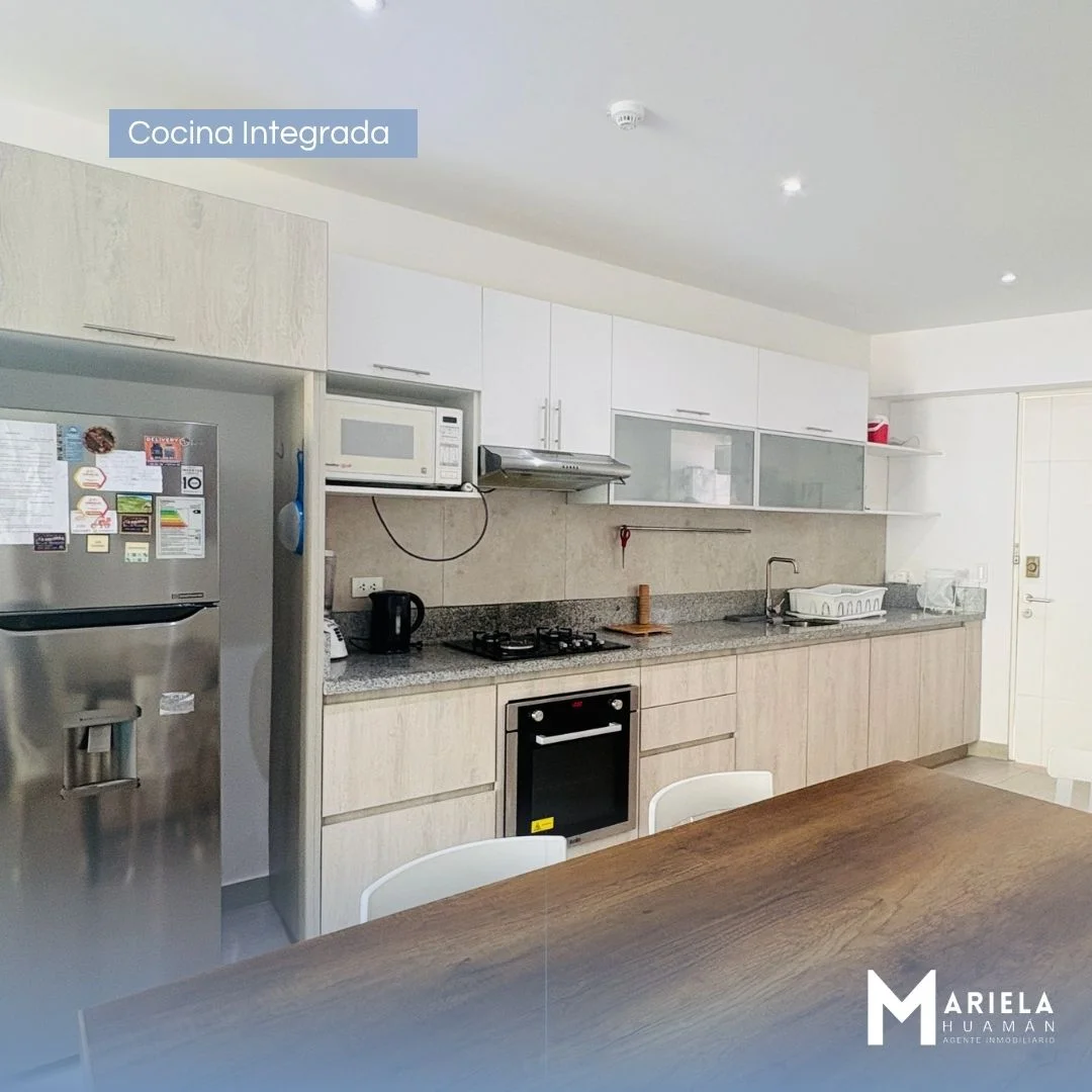 Living comedor, kitchenette full con barra de granito, lavandería y therma.