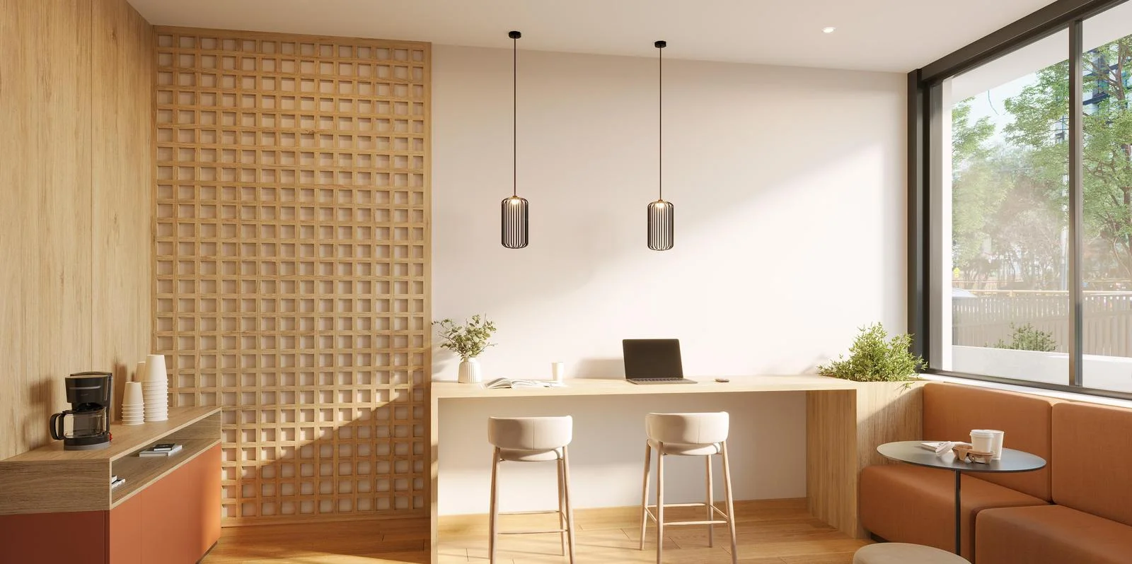 Áreas comunes: Lobby, Coffee Station, Bike Center, Jardín de niños, Co-working, Pet wash, Gimnasio, Lounge, SUM, Zona de parrillas, Lavandería, Sala de estar.