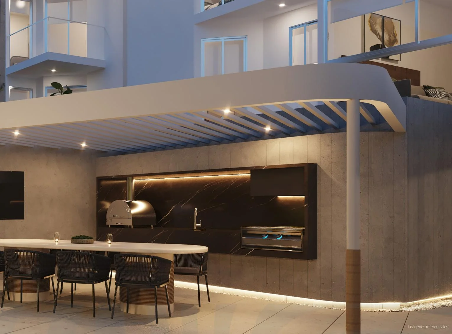 Áreas comunes: Lobby moderno, sala de juegos, patio central con terraza, zona de surf, zona fitness, coworking, dos áreas de parrilla y piscina.