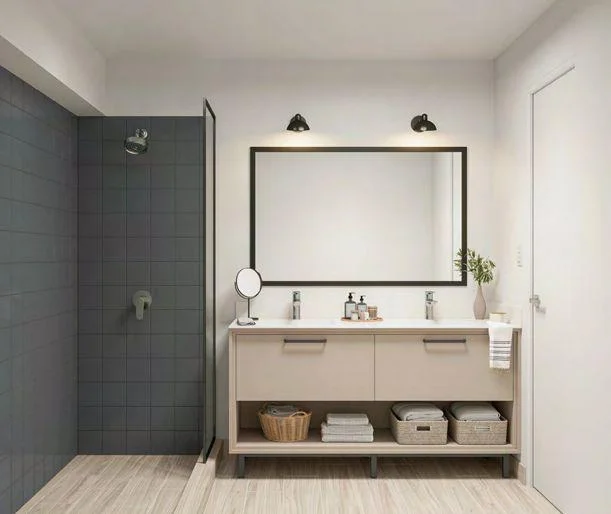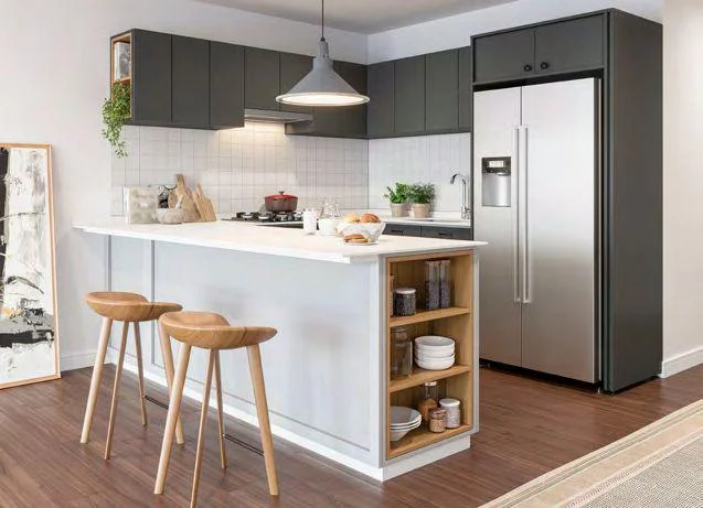 Cocinas equipadas, horno eléctrico y campana extractora. Revestimientos de cerámica blanca y tablero de cuarzo blanco. Baños con tablero de cuarzo blanco, revestimientos, griferias y sanitarios importados.