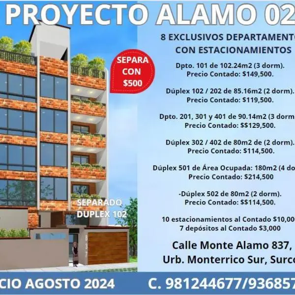 VENTA DE EXCLUSIVOS DEPARTAMENTOS JR MONTE ALAMO N URB MONTERRICO SUR SURCO FRENTE A PARQUE Separa con Fecha de inicio de julio Fecha de entrega diciembre Departamento de m dorm Salacomedor cocina cerrada lavandera dormitorio principal con closet y bao incorporado dos dormitorios con closet bao comn y patios Precio Contado Precio Crdito Hipotecario Dplex de m dorm er Nivel Salacomedor con vista a la calle bao de visita cocina lavandera escaleras internas de acceso al do Nivel dos dormitorios con closet y dos baos completos SEPARADO Precio Contado Precio Crdito Hipotecario Departamentos y de m dorm Salacomedor con vista a la calle cocina cerrada lavandera pasadizo dormitorio principal con closet y bao incorporado dos dormitorios con closet y bao completo comn Precio Contado Precio Contado Dplex de m de dorm er Nivel Salacomedor con vista a la calle bao de visita cocina lavandera escaleras internas de acceso al do Nivel dos dormitorios con closet y dos baos completos Precio Contado Precio Crdito Hipotecario Dplex de rea Ocupada m dorm er Nivel Salacomedor con vista a la calle Cocina cerrada con alacena bao de visita dormitorio principal con closet y bao incorporado bao completo segundo dormitorio con closet y escalera interna de acceso al do Nivel azotea Llegada a un pasadizo er dormitorio con closet y bao incorporado igual al principal cuarto dormitorio con closet bao completo lavandera y terraza Precio Contado Precio Crdito Hipotecario Dplex de m dorm er Nivel Kitchenette sala pasadizo dormitorio con closet bao completo comn escalera interna de acceso al do Nivel azotea Llegada a un pasadizo segundo dormitorio bao completo lavandera y terraza Precio Contado Precio Crdito Hipotecario estacionamientos al Contado y con Crdito Hipotecario dlares depsitos FORMAS DE PAGO Separa con que sern descontados a la firma del contrato Minuta CONTADO er Pago A la Firma de Contrato do Pago al Techado er Piso er Pago al Techado er Piso to Pago al Techado del to Piso to Pago Entrega de DEPARTAMENTO CRDITO HIPOTECARIO DE INICIAL BANCO CONTCTANOS AL