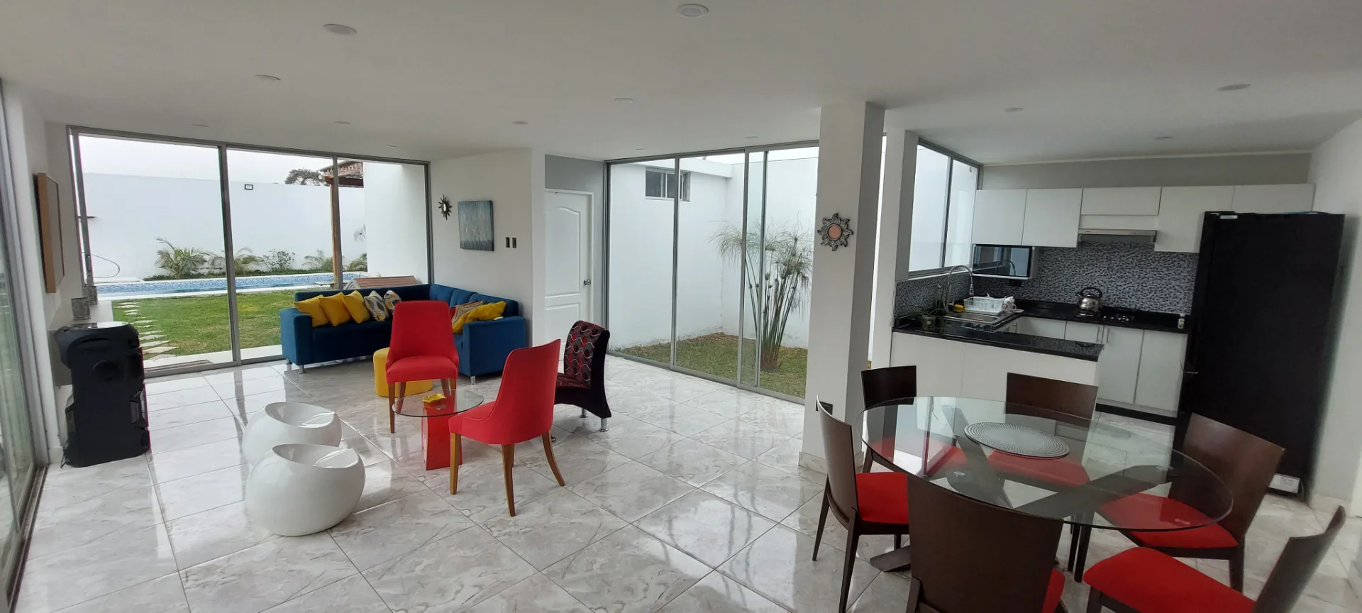 Excelente Casa de Campo en alquiler en Pachacamac, full amoblada. Ubicada a 4 minutos de Canal, 4 de Pachacamac. Cuenta con un área de terreno de 400 m2 de los cuales tiene 130 m. de área construida y 270 m. de área libre (área social, jardín, parrilla y piscina de 3 x 6 metros). Consta de sala comedor con salida y vista al jardín, televisor de 65”, equipo de sonido, baño de visita, cocina abierta con reposteros altos y bajos equipada (refrigeradora, microondas, sándwichera, licuadora, arrocera, cafetera) 3 dormitorios cada uno con baño incorporado, dormitorio principal con vista al jardín y piscina, televisor de 50”, closet en cada dormitorio, 3 baños completos, estacionamiento. La casa cuenta con Internet y Movistar Play