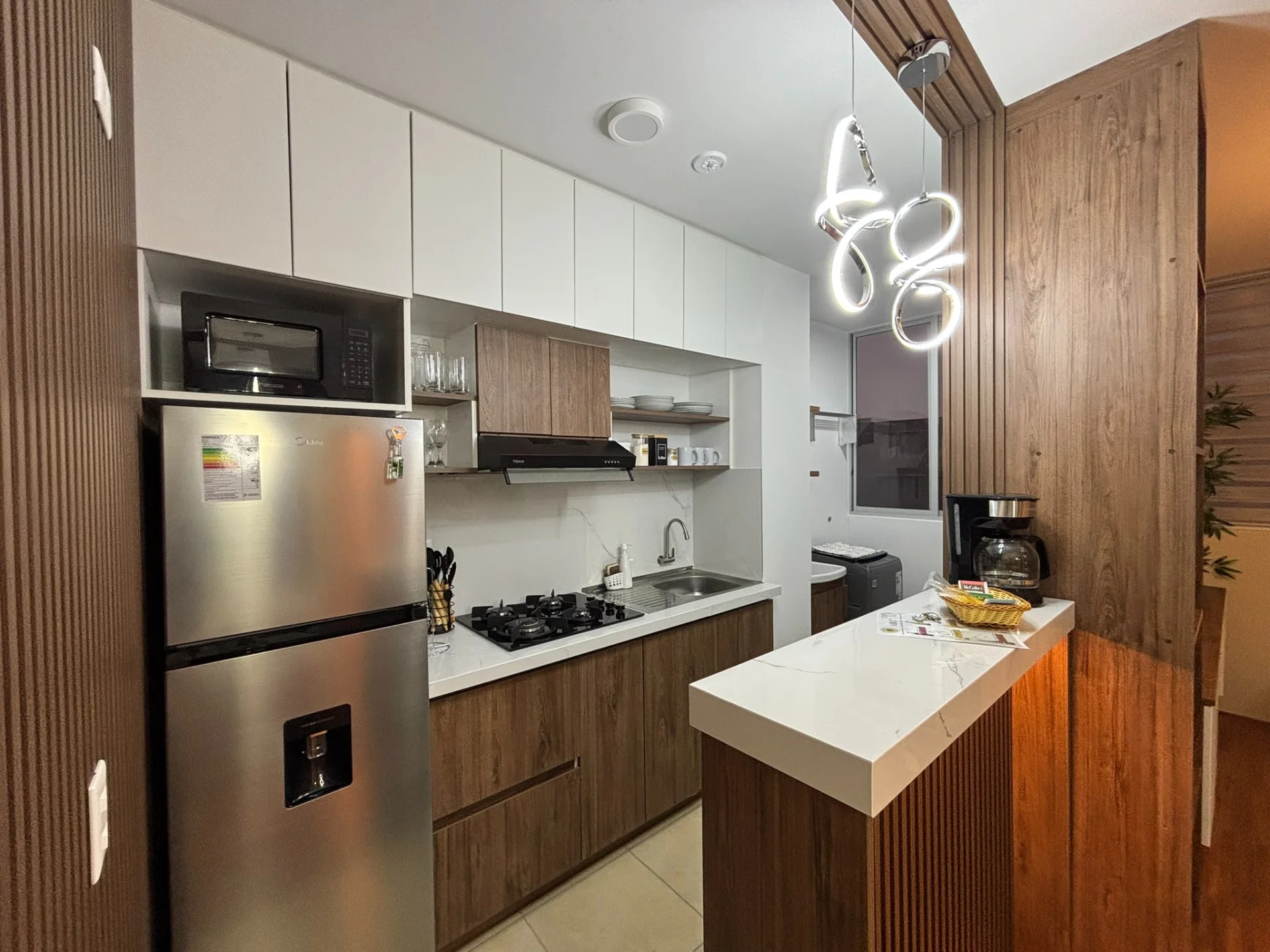 ???? Cocina con concepto abierto, equipada con reposteros altos y bajos