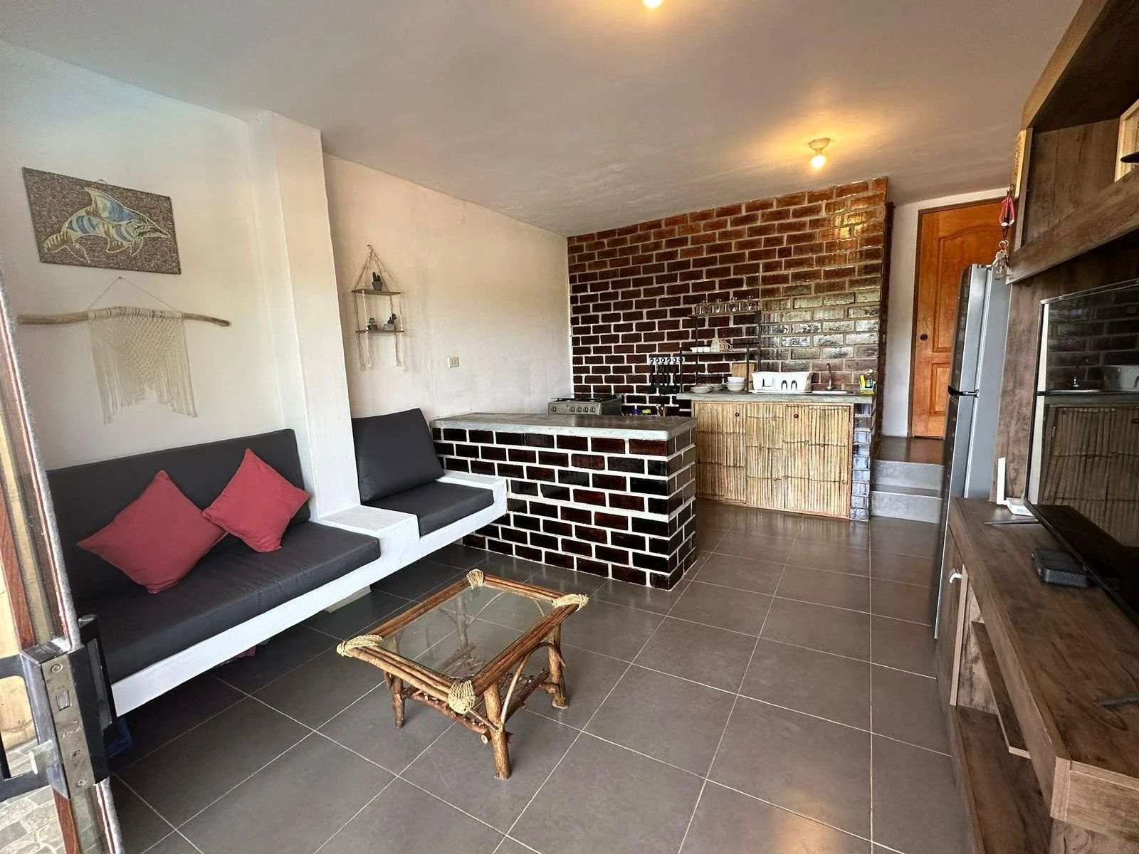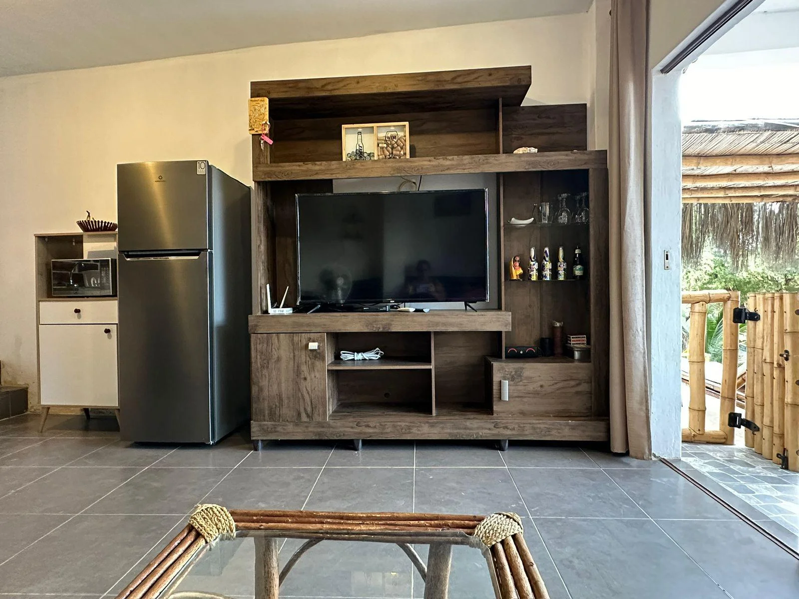 Amplia sala con centro de entretenimiento.