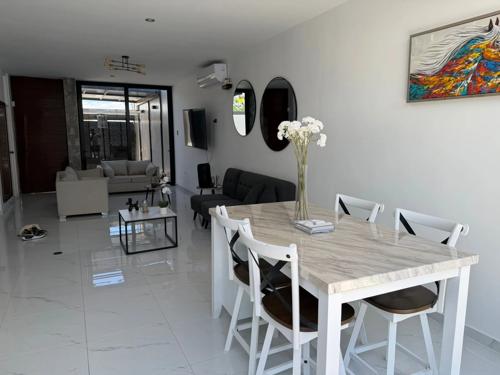 El inmueble cuenta con 4 amplios dormitorios con A/C, 5 baños, sala amplia con A/C, cocina moderna, comedor espacioso, cochera, jardín interno y lavandería independiente.