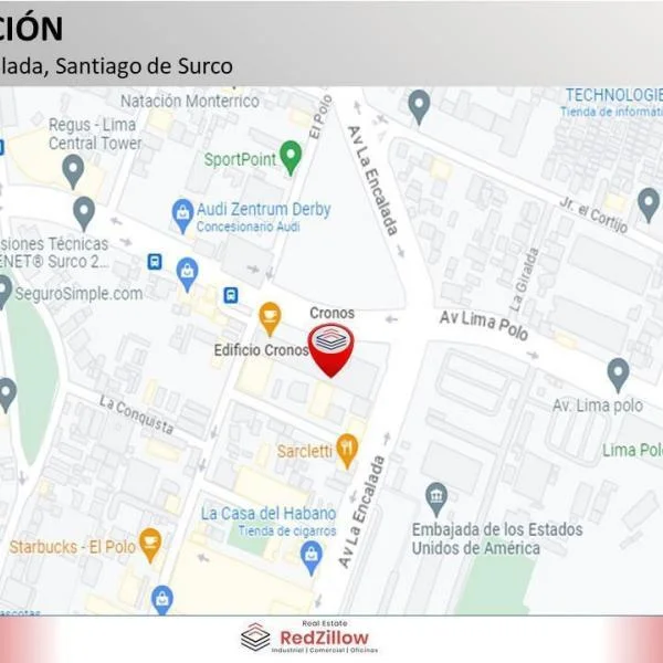 ALQUILER DE OFICINA IMPLEMENTADA m SURCO TIPO Amplia oficina de m modernamente implementada en el piso del edificio Cronos ubicado en la zona empresarial del distrito de SurcoUBICACIN Av Encalada en el distrito de Surco en zona empresarial y comercial CARACTERSTICAS DE EDIFICIO Sala de Usos Mltiples Sala de Proveedores Aire Acondicionado Grupo Elctrgeno CONTACTAR Celular WhatsApp Igualmente puedes comunicarte para revisar nuestra disponibilidad de locales similares o alternativos que se ajusten a tu necesidad Somos RedZillow especialistas en servicios corporativos abarcando desde la representacin de propietarios y arrendatarios hasta el financiamiento de capital a largo plazo Nuestra meta es ayudarte a fortalecer y enriquecer la inversin en tu negocio ocupndonos de soportar tus decisiones inmobiliarias sobre espacios de oficinas almacenes retail terrenos y plantas industrialesSomos RedZillow especialistas en servicios corporativos inmobiliarios con alto compromiso y experiencia en la representacin de propietarios compradores y arrendatarios Nuestra meta es ayudarte a encontrar el mejor espacio para negocio o actividad comercial ocupndonos de soportar tus decisiones inmobiliarias relacionadas a espacios de almacenes plantas industriales locales comerciales oficinas y terrenos