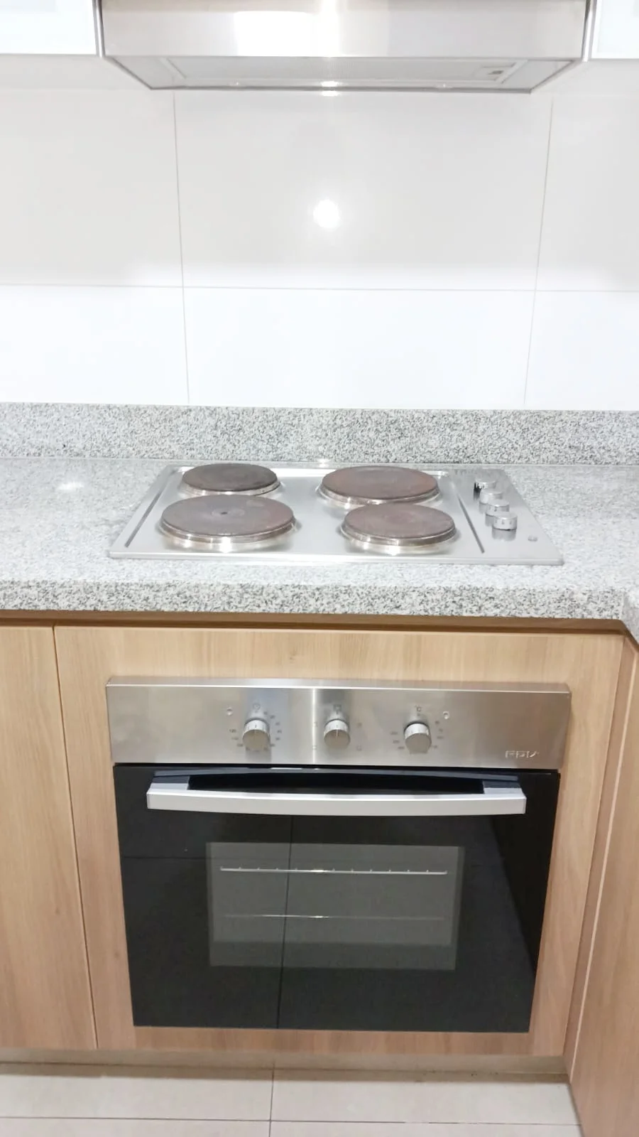 Cocina americana equipada con cocina, horno, campana extractora, reposteros altos y bajos, y tablero de granito