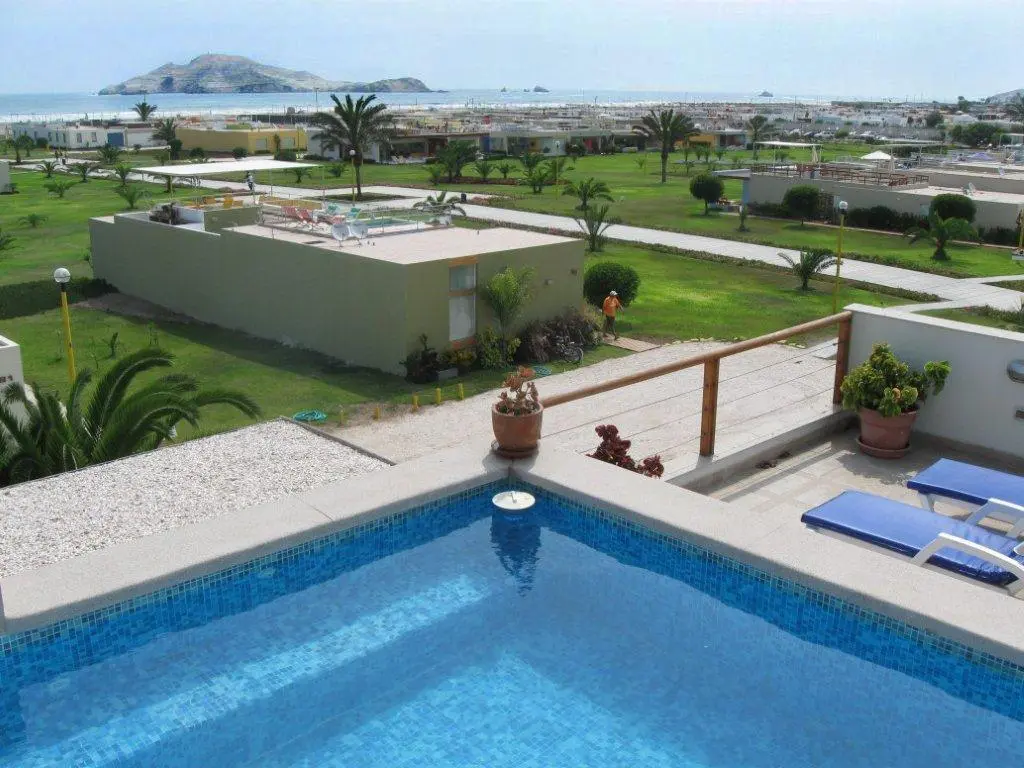 Tercer piso: amplia azotea con mesa comedor y 8 sillas, asientos con cojines, piscina, BBQ, toldo y luces, con vista al mar y a los cerros.