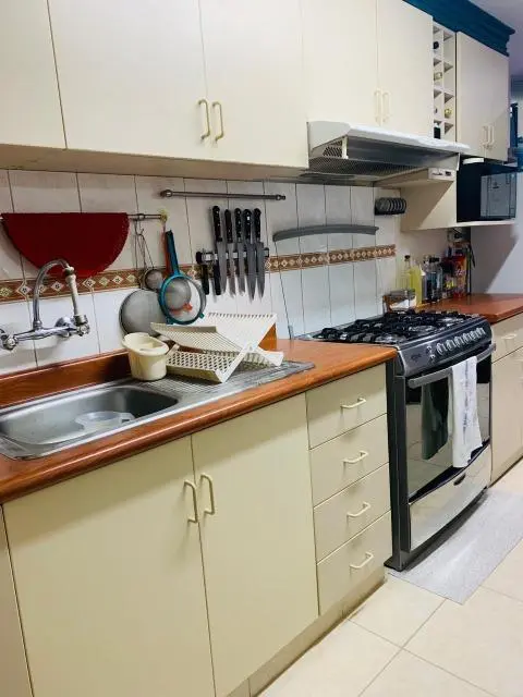 Cocina alargada con muebles altos y bajos completos. Incluye artefactos (cocina, refrigeradora, cafetera, licuadora, congeladora vertical, waflera, batidora, almacén tipo closet, vajillas, menaje completo de cocina).