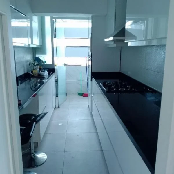 estudio bao completo amplia sala comedor cocina con muebles altos y bajos en High gloss con tableros de granito