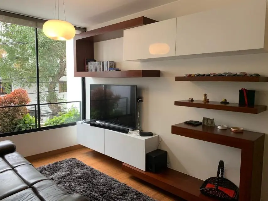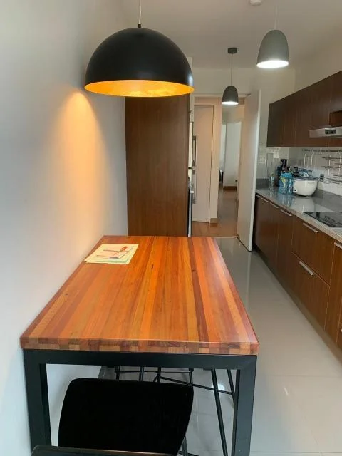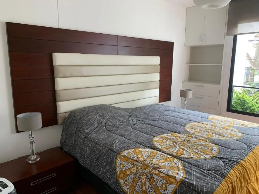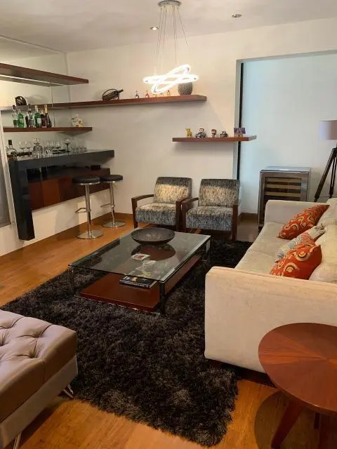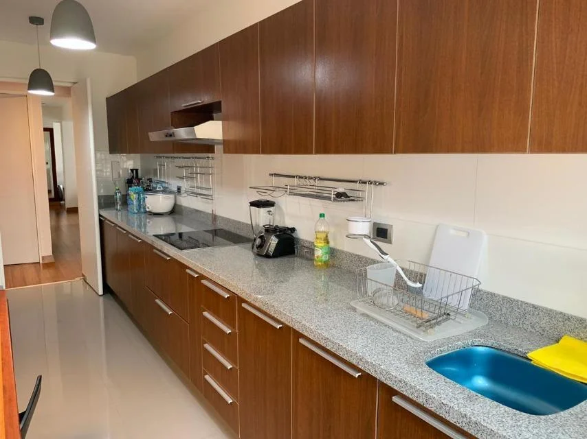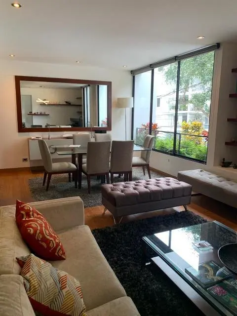 Elegante departamento en la mejor zona de Miraflores, acabados A1, decoración preciosa, mucha iluminación. Tiene 02 dormitorios ya dicional sala estar y escritorio. Cocina con comedor de diario y área de servicio completa! Amoblado y equipado, 3 años de antiguedad, vista a la calle, moderno, piso 2, guardianía, flat. Hall de ingreso, sala, comedor, comedor de diario, escritorio, sala de estar, 2 dormitorios, 2.5 baños, 1 baño incorporado, 1 cuarto de servicio, 1 baño de servicio, lavandería, pisos de madera en área social, pisos de madera en área privada. 2 cocheras tipo paralelas, ascensor. No mascotas, walk-in closet, disponible desde el ****.