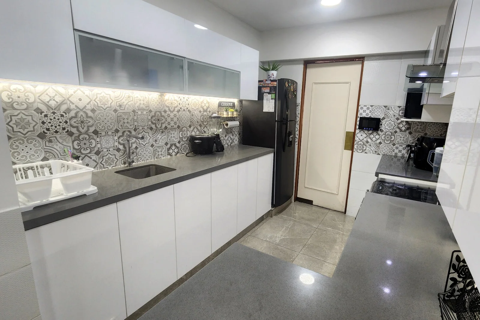 Acogedora sala de estar que colinda con la amplia cocina que cuenta con comedor de diario y también en este ambiente se ubica la lavandería.