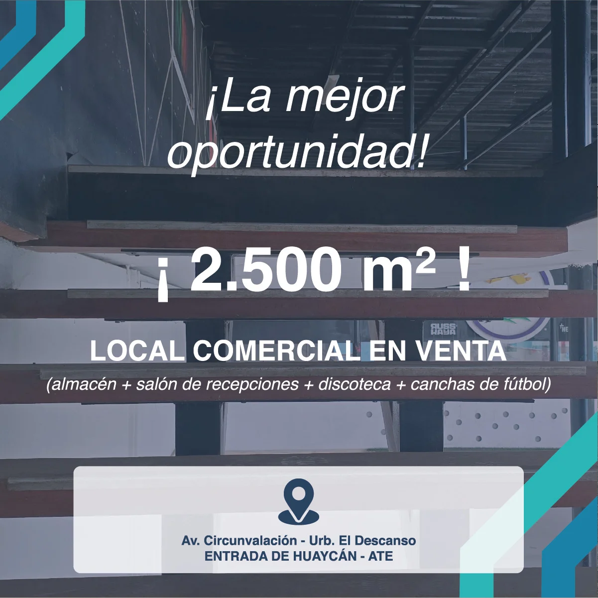 Cuenta con: 2 tiendas comerciales, 1 discoteca, 2 canchitas sintéticas de fulbito 7, 2 almacenes, 2 baños y vestidores.