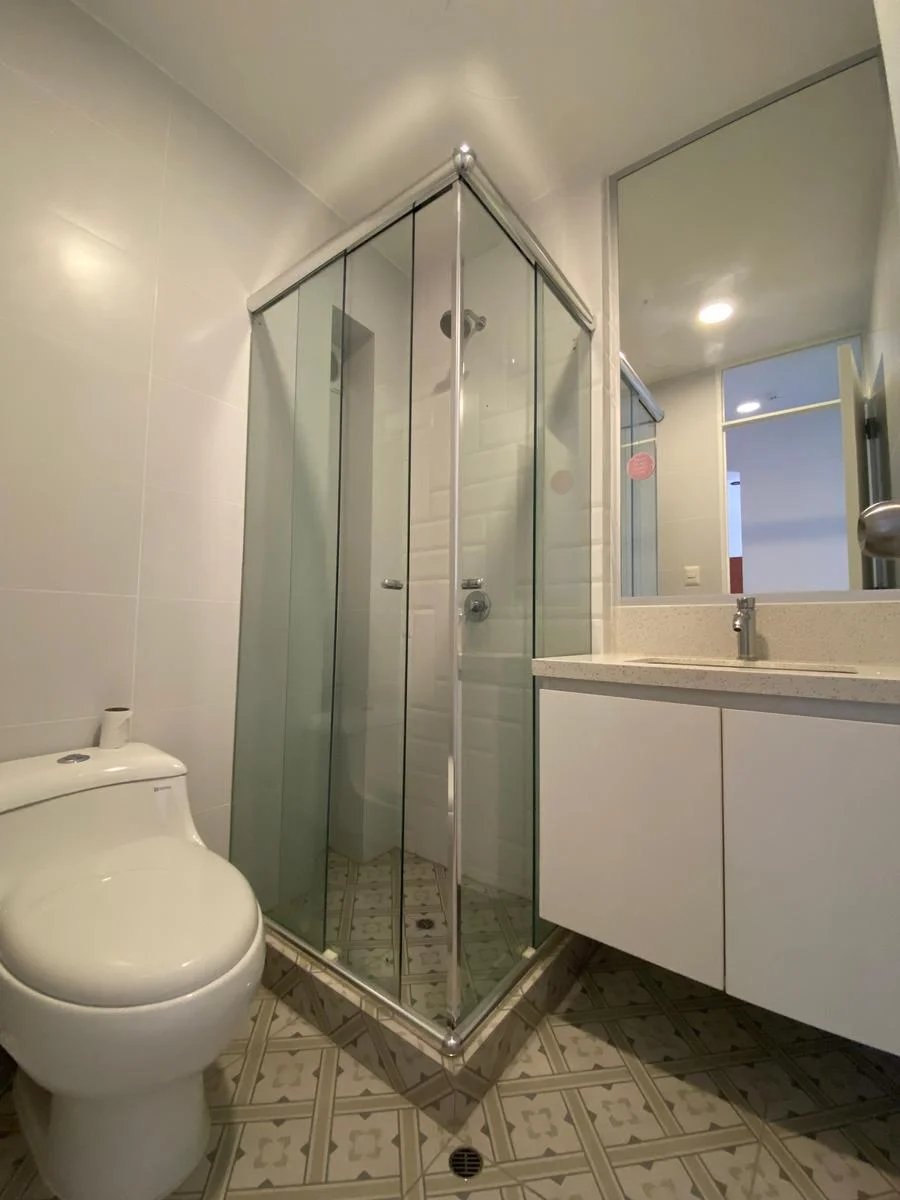 1 baño completo (ubicado fuera del dormitorio), con ducha y puertas de vidrio templado.