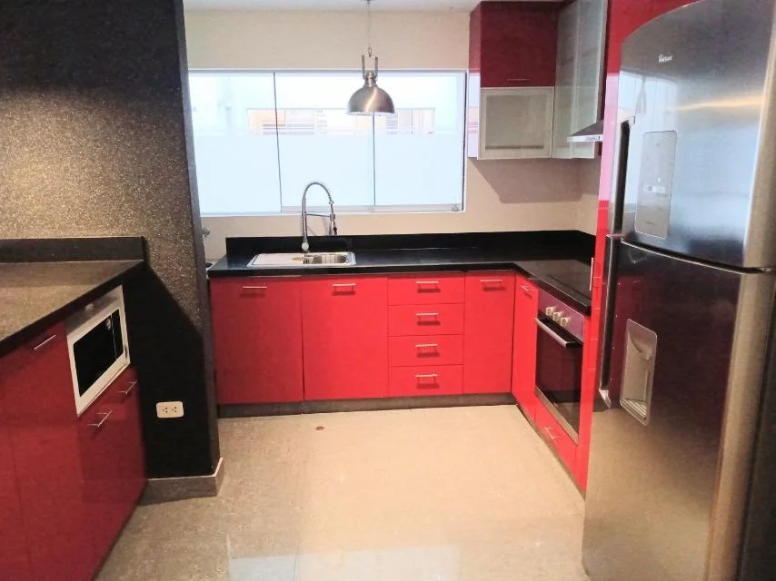 * La cocina viene equipada con refrigeradora, horno microondas, hornillas encimeras y horno empotrado.