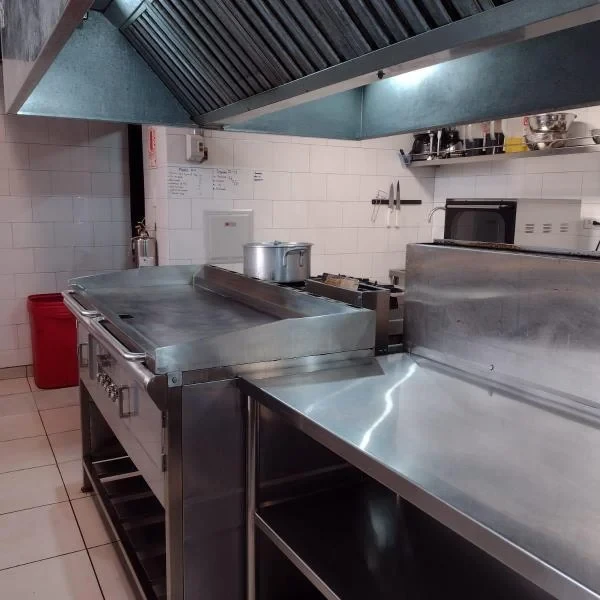 AMBIENTE AMPLIO DE COCINA CON LUCES DETECTOR DE HUMO REPISAS DE ACERO FREIDORA COCINA MESAS AMPLIA CAMPANA ESTRACTORA CON MOTOR ETC EL EQUIPAMIENTO IDEAL PARA LA PREPARACION DE LOS DIVERSOS PLATILLOS