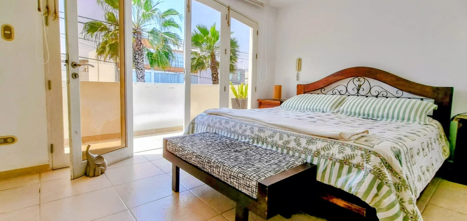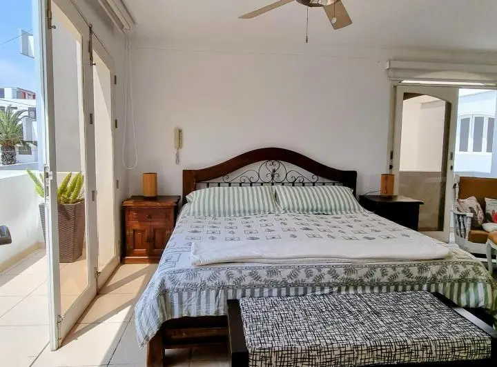 dormitorio principal con cama queen y vista diagonal al mar,