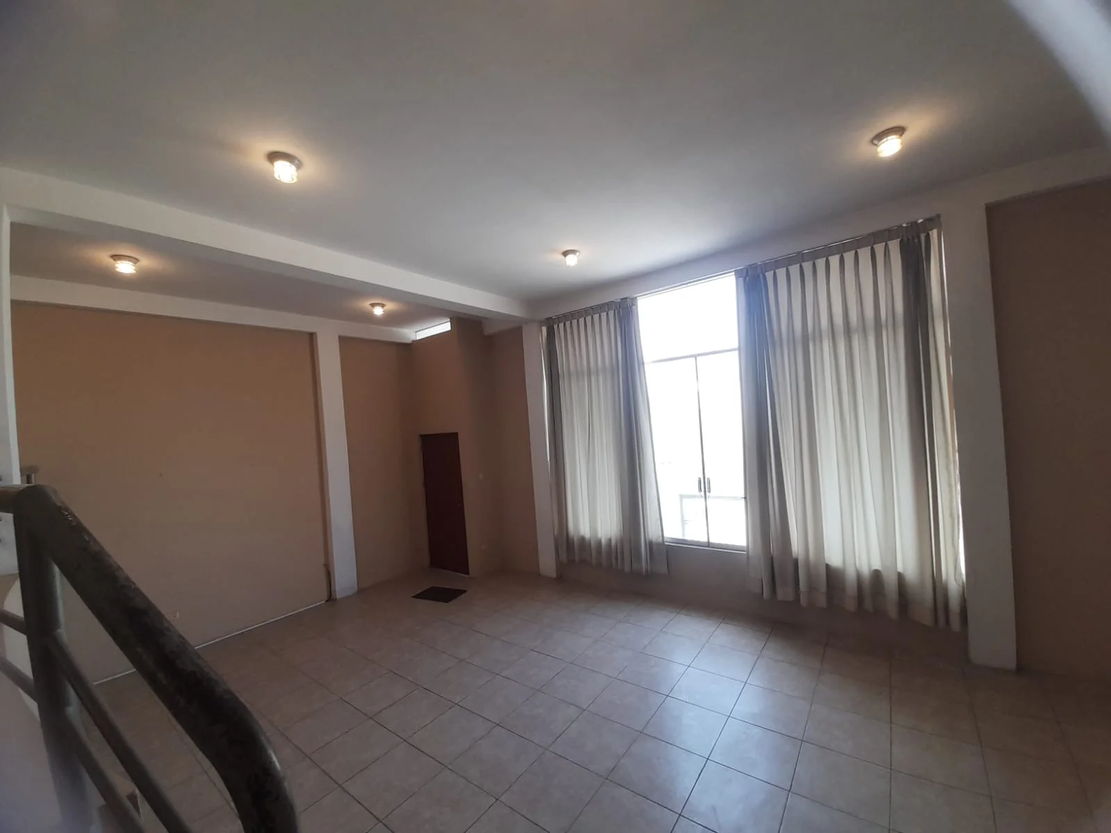 Primer nivel: Sala amplia con techo alto, medio baño de visita, comedor, ambiente para estudio u oficina, cocina abierta y patio interno.