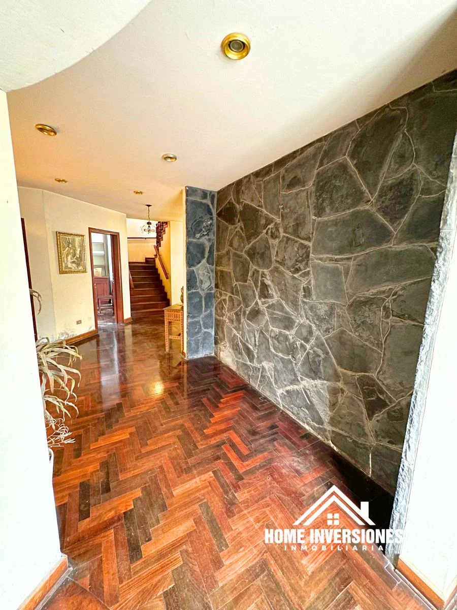 - Piso 1: Ingresamos a la propiedad y encontramos un hall de recepción, sala con chimenea, comedor, y cocina cerrada con alacena. Cuarto de estudio, medio baño de visitas y área bar. Tanto la cocina y sala cuenta con acceso al jardin posterior.