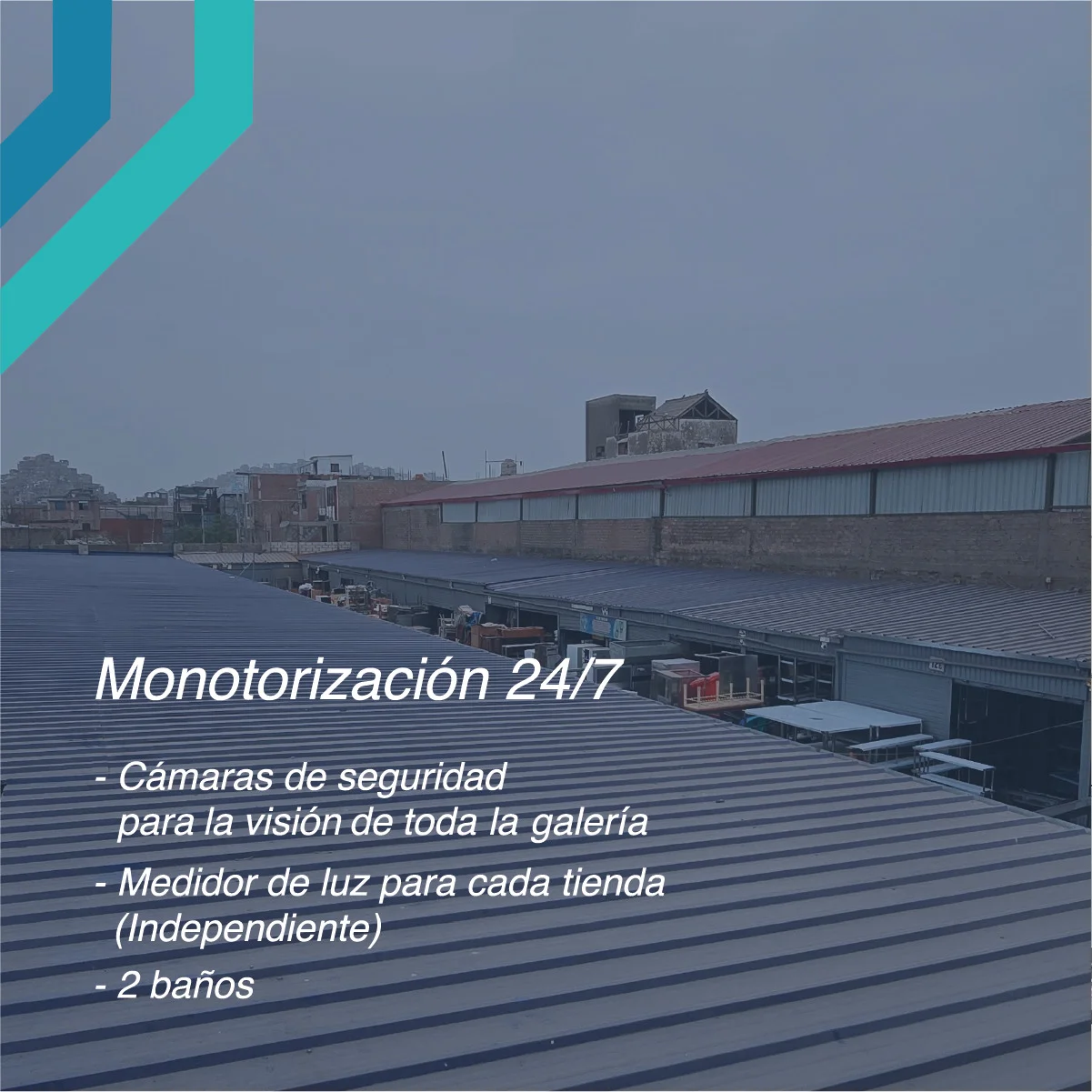 Cuenta con: 30 tiendas de material ligero, 2 baños, cámaras de seguridad y medidor para cada tienda.
