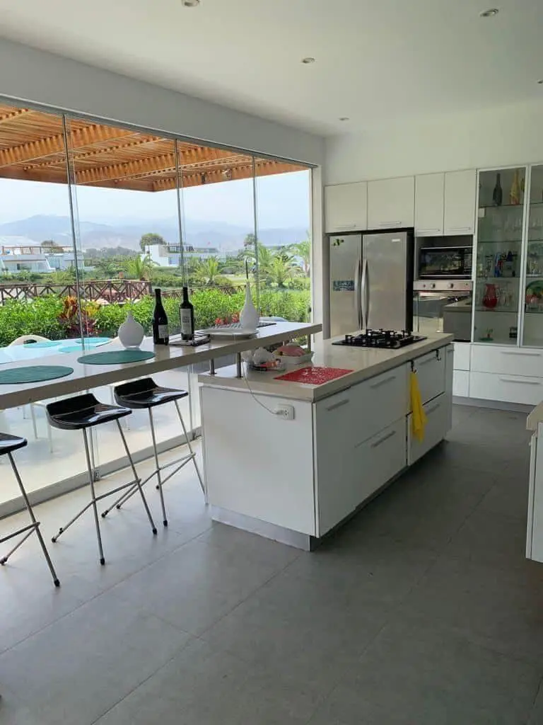 Sala principal con kitchenette con isla, también con vista a la laguna