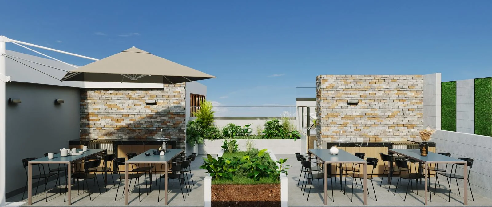 Áreas comunes: Lobby, Functional Center, SUM gourmet, Terraza, Piscina, Zona de parrillas.