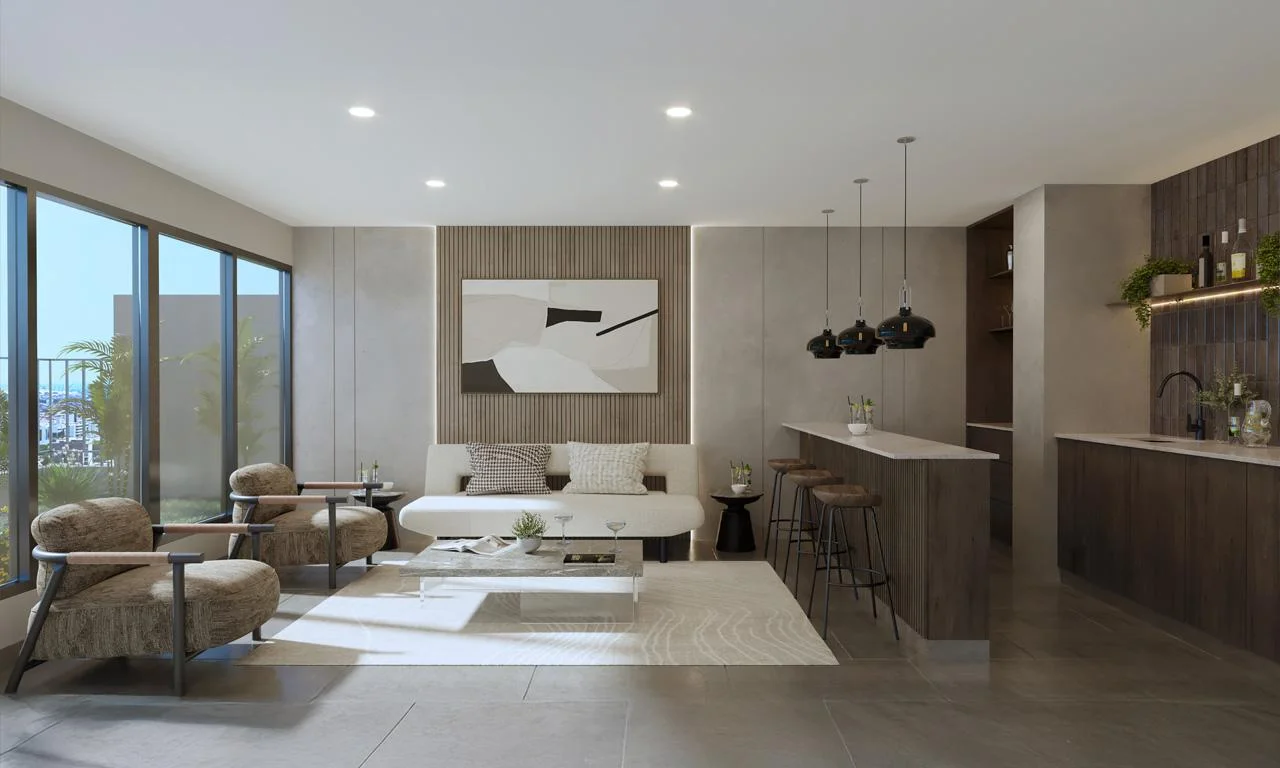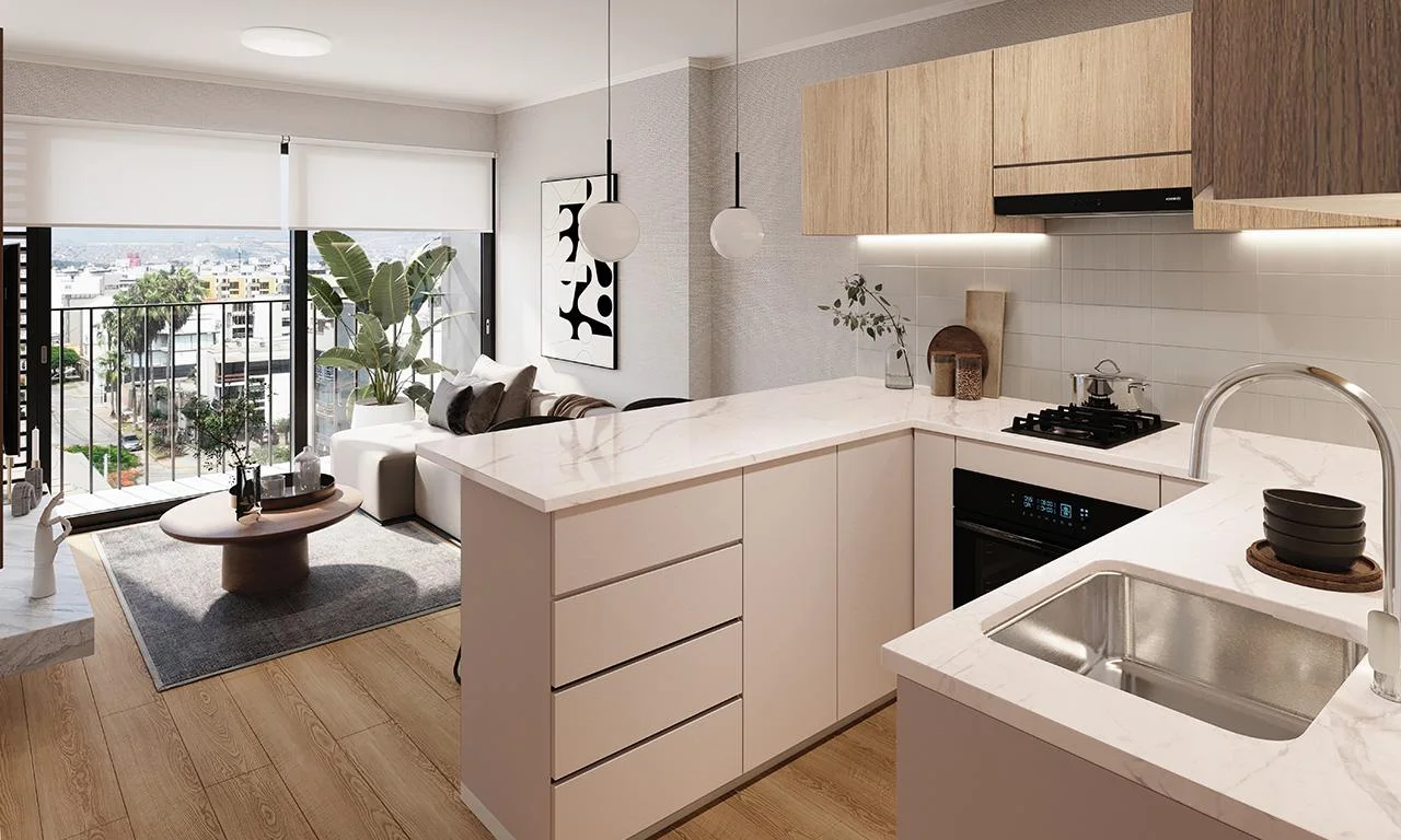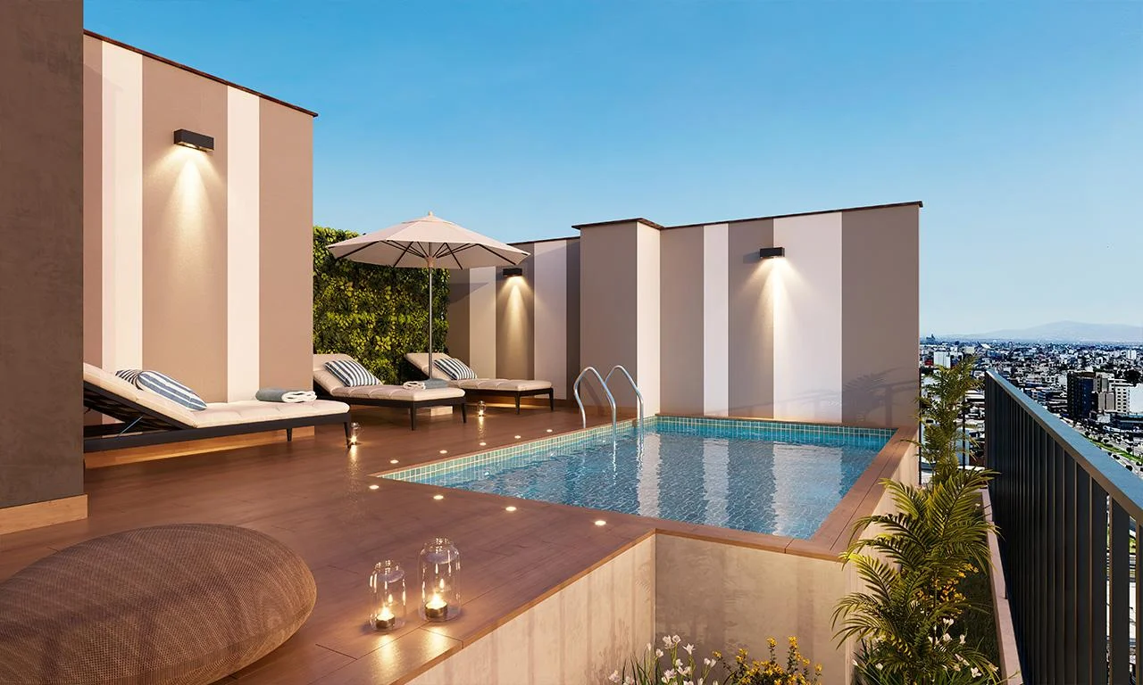 Áreas comunes: Lobby de doble altura, zona de parrilla, SUM, Piscina panorámica, coworking, pet shower, lavandería, sala de niños, sala de cine.