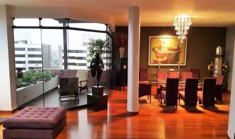 Penthouse de A.O. : 650 m, A.C. : 800 m, Aires : 150 m. Hall, 3 salas, chimenea, living-comedor, comedor, comedor de diario, cocina cerrada, lavandería, escritorio, estar familiar, 4 dormitorios, walk-in closet, 5.5 baños, 5 baños incorporados, jacuzzi, tina en el baño, 1 cuarto de servicio, 1 baño de servicio, 3 cocheras tipo paralelas en sotano, 1 depósito, pisos de madera en área social, 2 ascensores, ascensor directo, ascensor de servicio, ascensor, terraza de 150.00 m2, patio, piscina, parrilla. Áreas comunes, gimnasio común. Piso 22, 23 pisos, 1 departamento por piso, 21 departamentos en total. Aire acondicionado, guardianía, se permiten mascotas, triplex, 26 años de antigüedad, frente al golf, impecable.