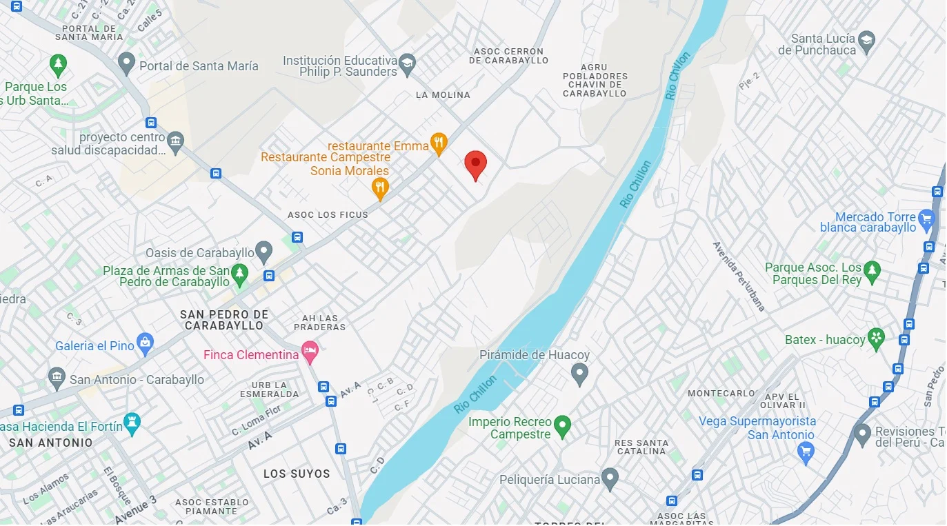 Ubicado en el distrito de Carabayllo, a 2 cuadras de la Av. José Saco Rojas, en la urb. “Sol de la Molina”, frente a un parque deportivo; a 15 minutos del ovalo de Puente Piedra, del mercado Huamantanga, del Centro Financiero de Puente Piedra y de la Av. Panamericana Norte.