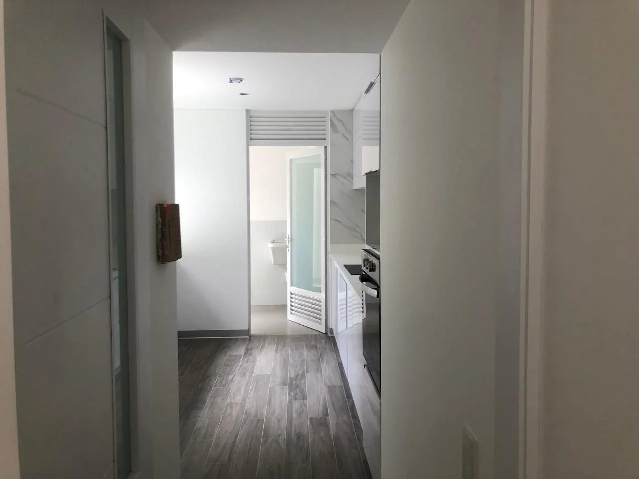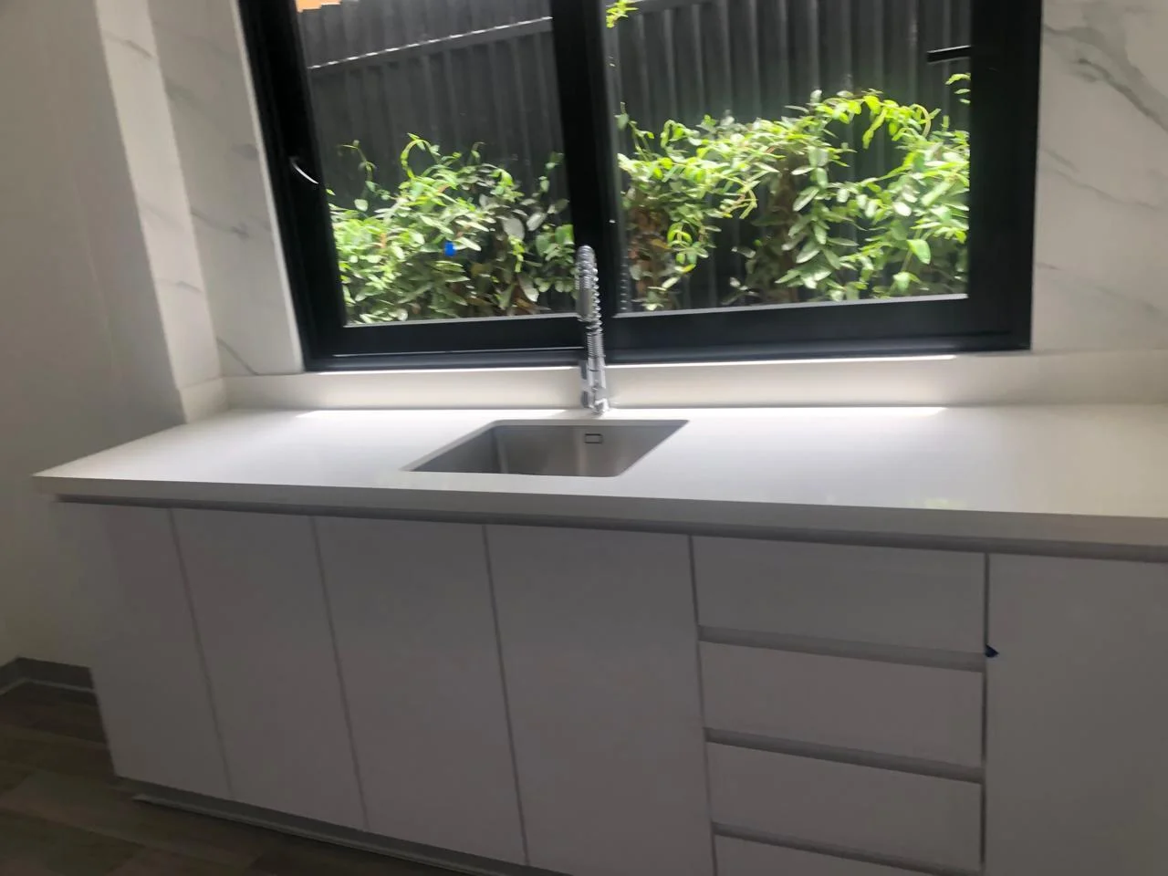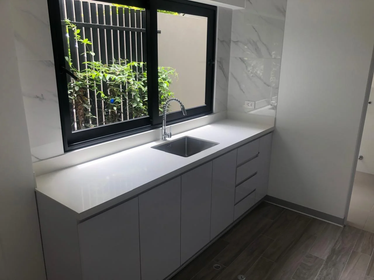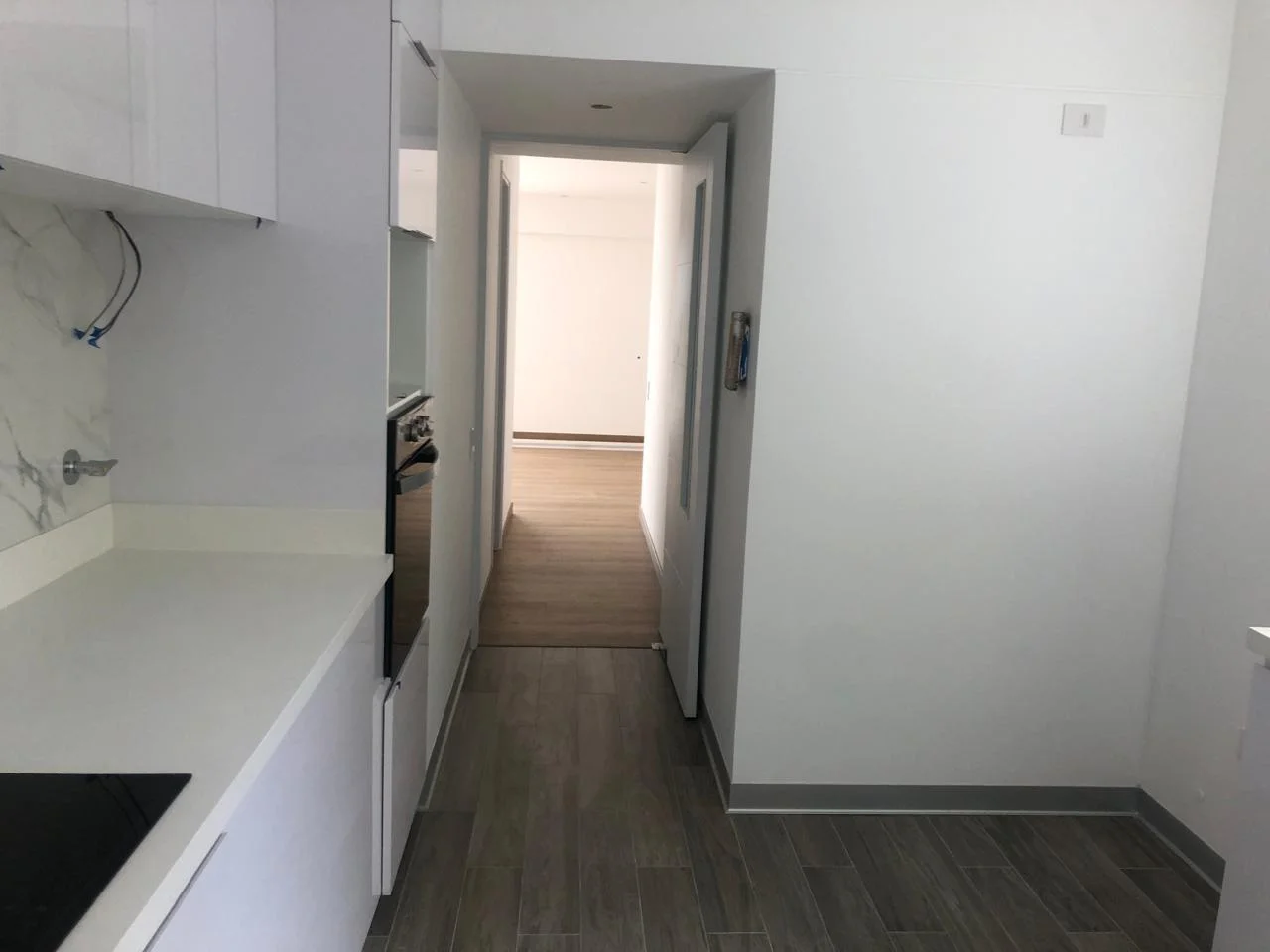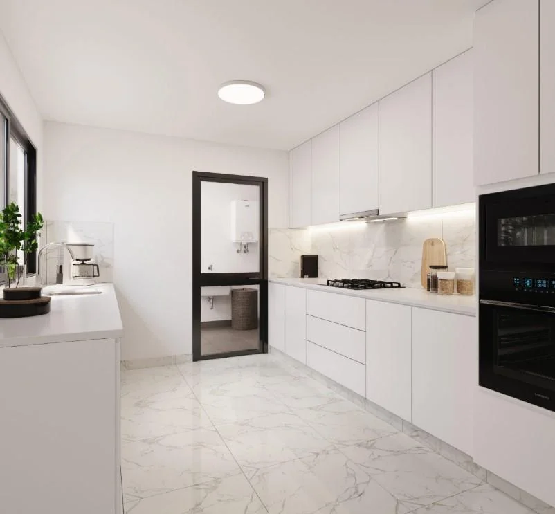 • Cocina cerrada de cuarzo blanco.