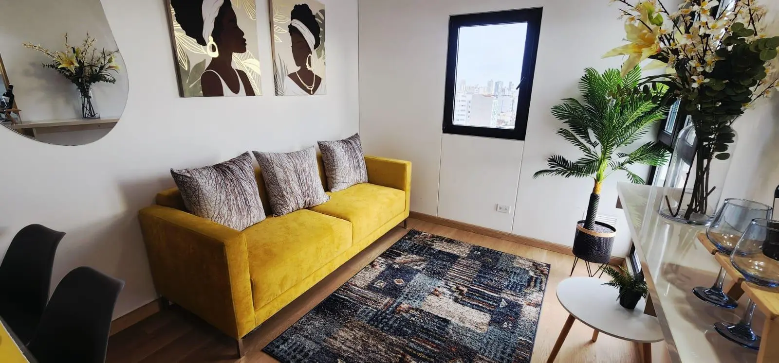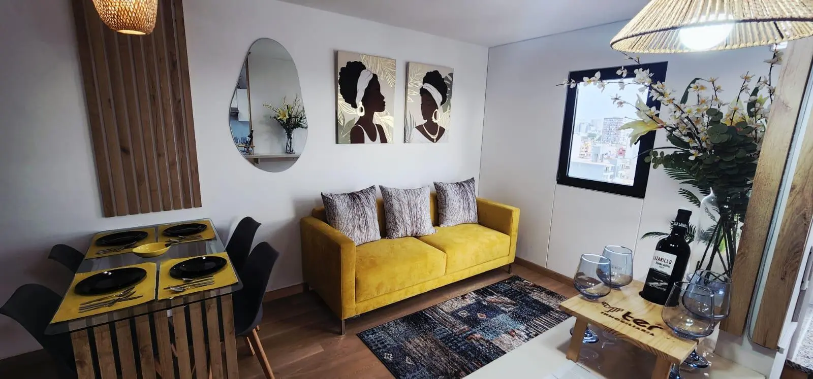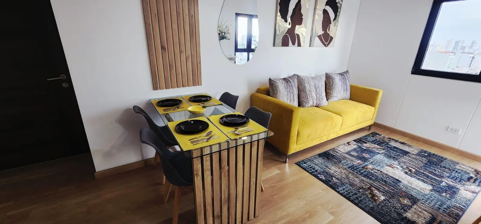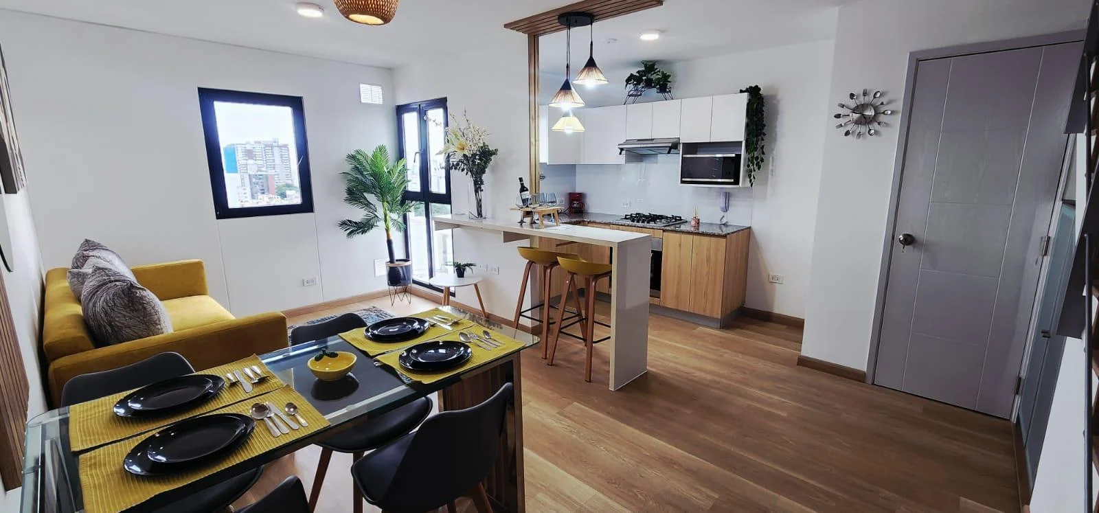 Sala comedor amplia, iluminada, con vista interna al patio del edificio